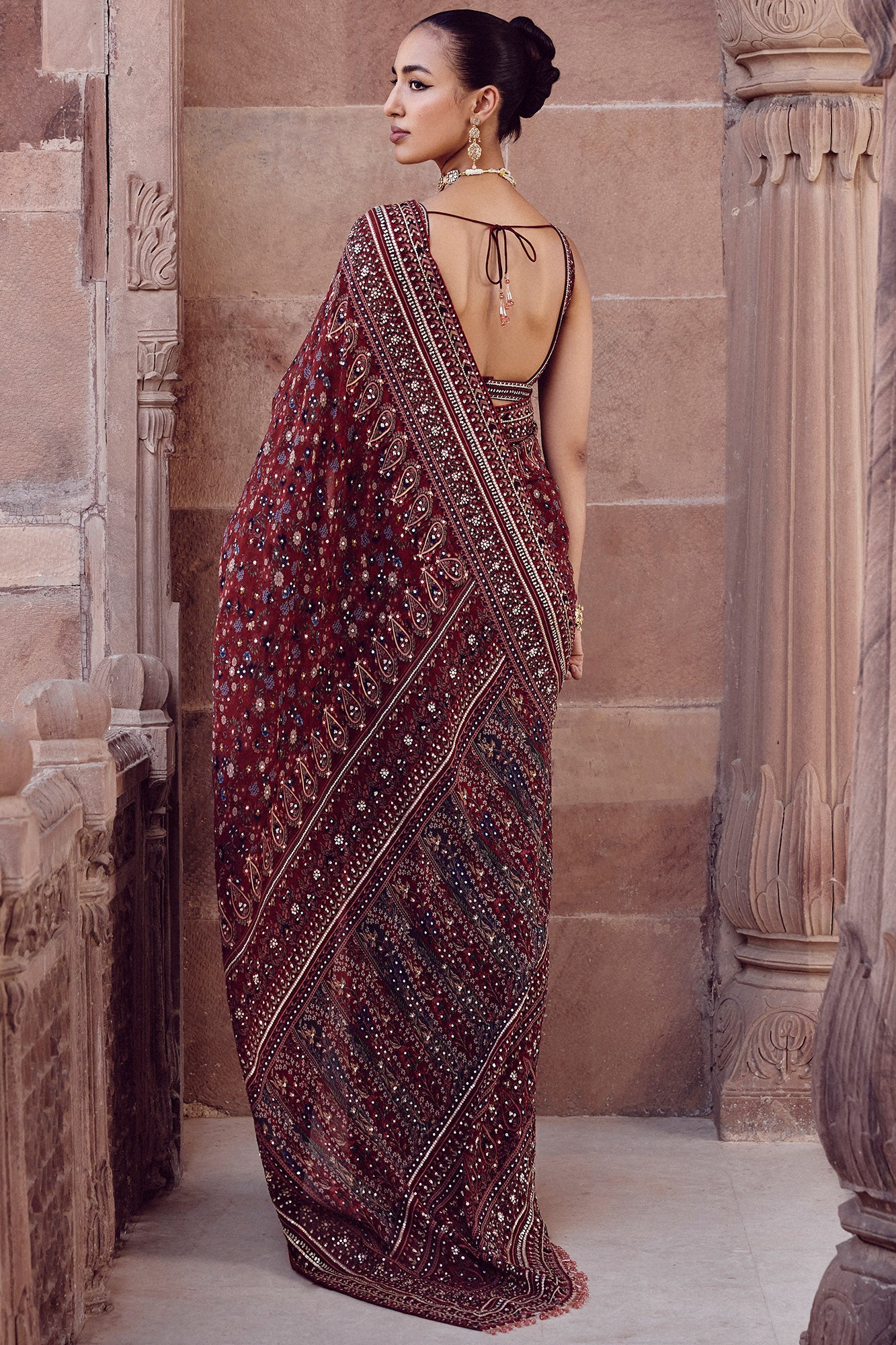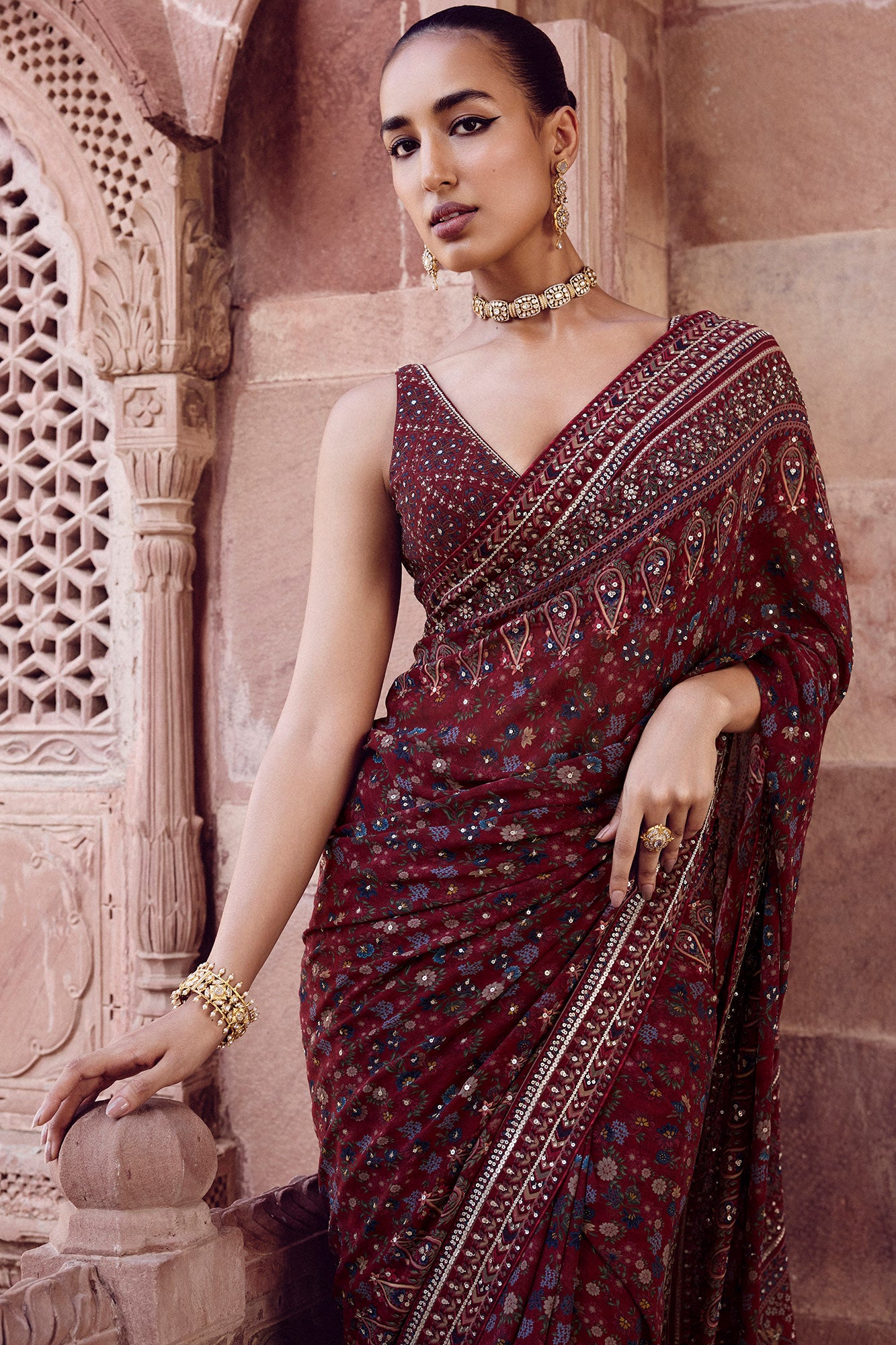 Inspired by palatial gardens, our breezy Amalaka Saree features blooms & ferns. Crafted in light-as-air georgette, it is elevated in sequins for celebrations.