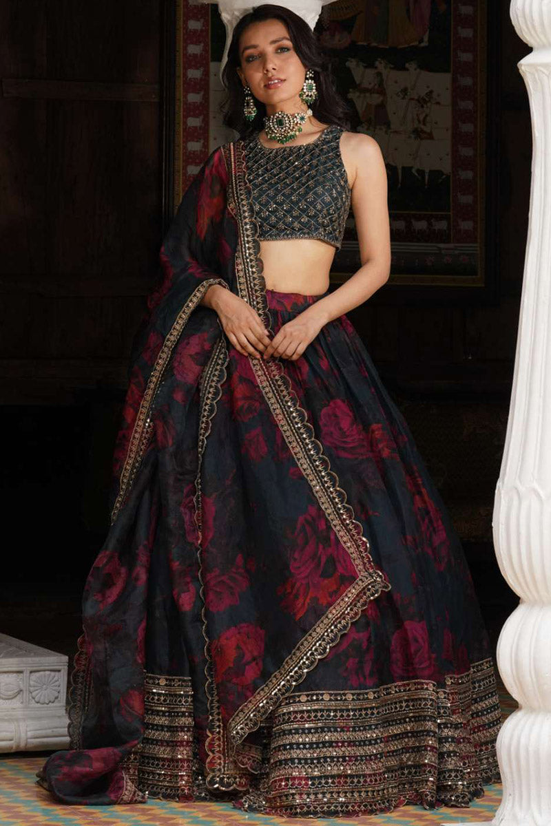 Teal blue floral lehenga set in organza silk.
