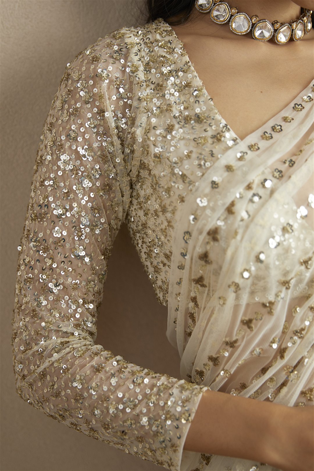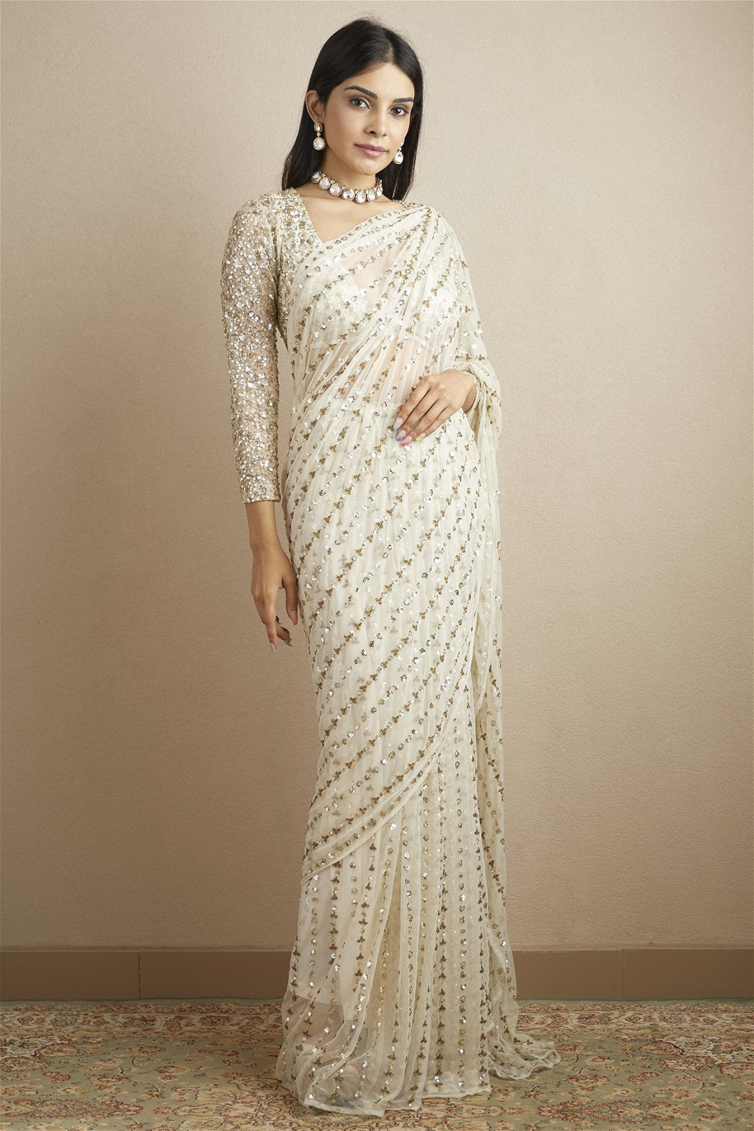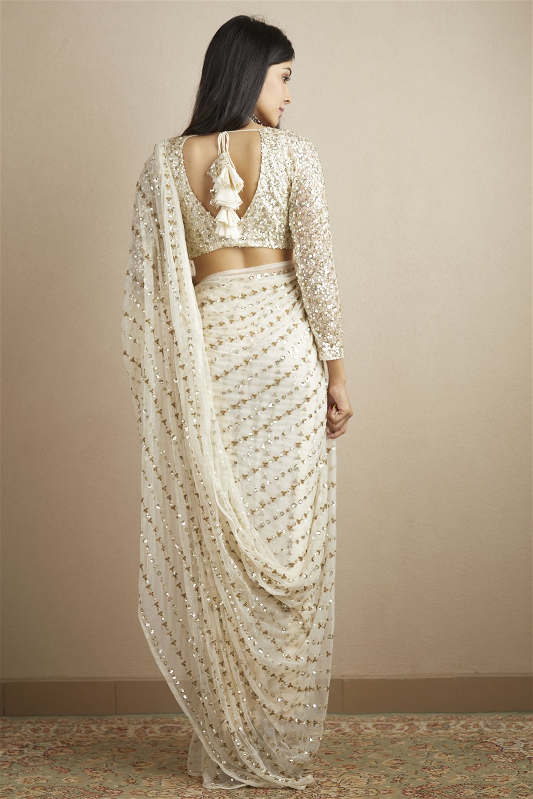 Off White Sequin and Beads Saree