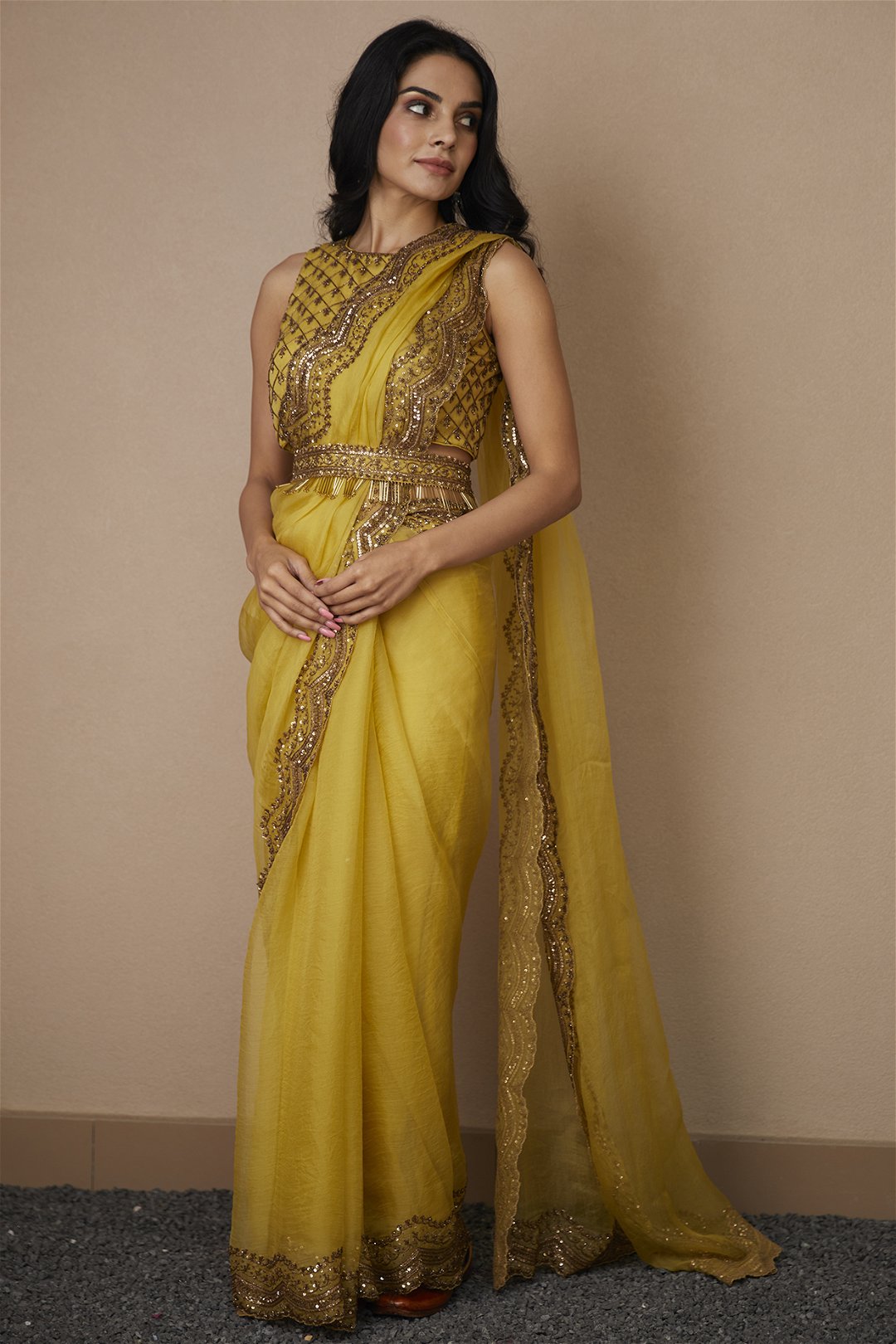 Yellow Organza Sequin and Beads Saree Set