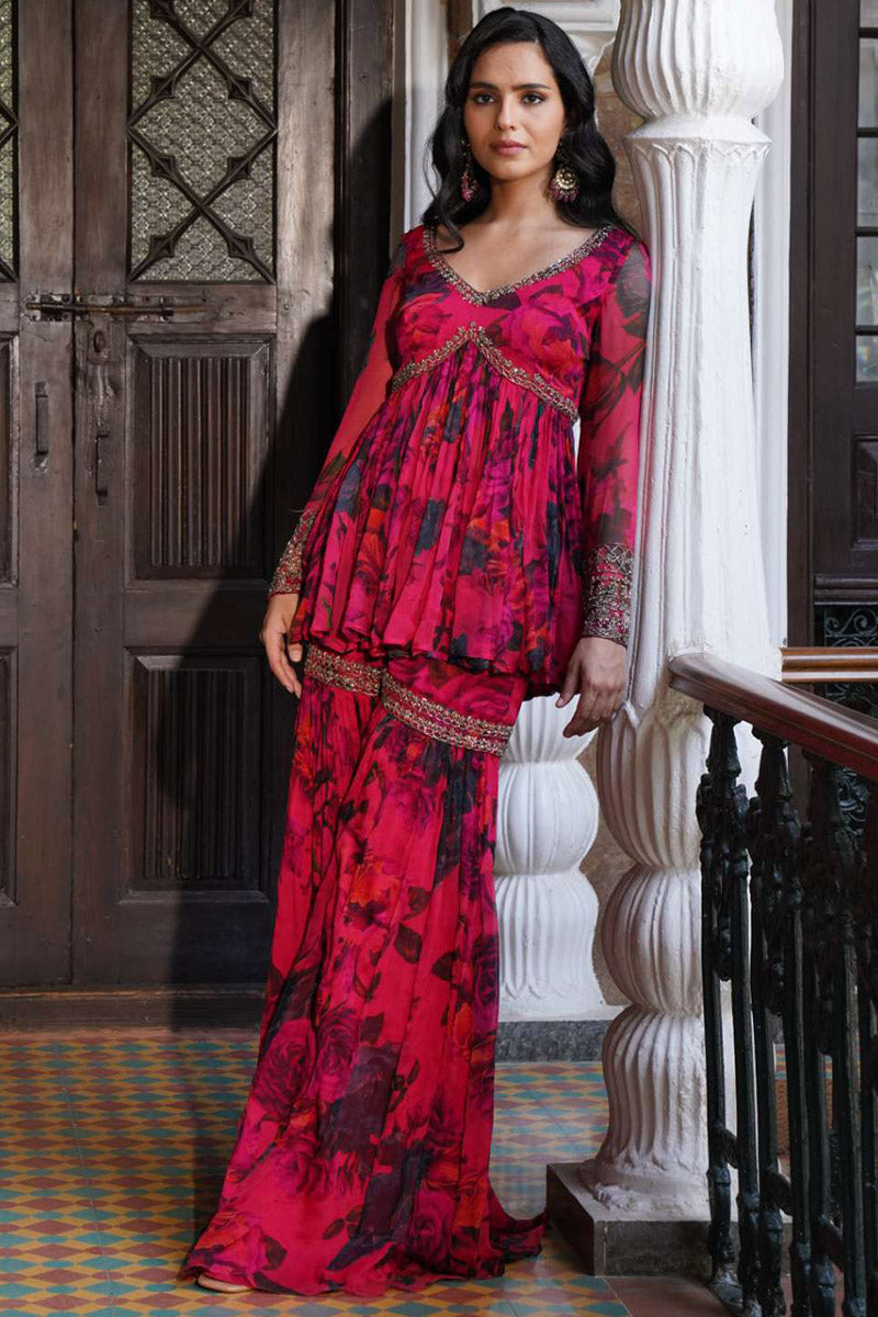 Carmine Chiffon Floral Peplum Set