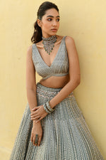 Organza based lehenga finely hand embroidred embroidered with zardosi, sequence, kundan and glass beads paire. it is with a matching blouse and a embroidered cape dupatta.