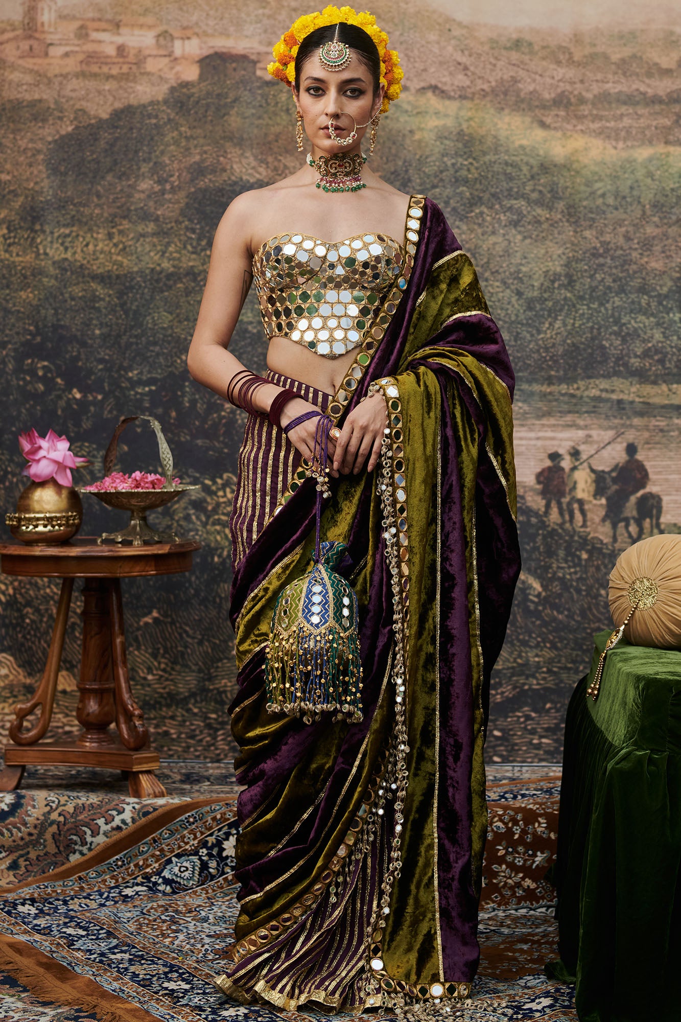 Velvet Olive and green panelled saree styled with mirror work corset blouse on gota lined with chanderi silk.