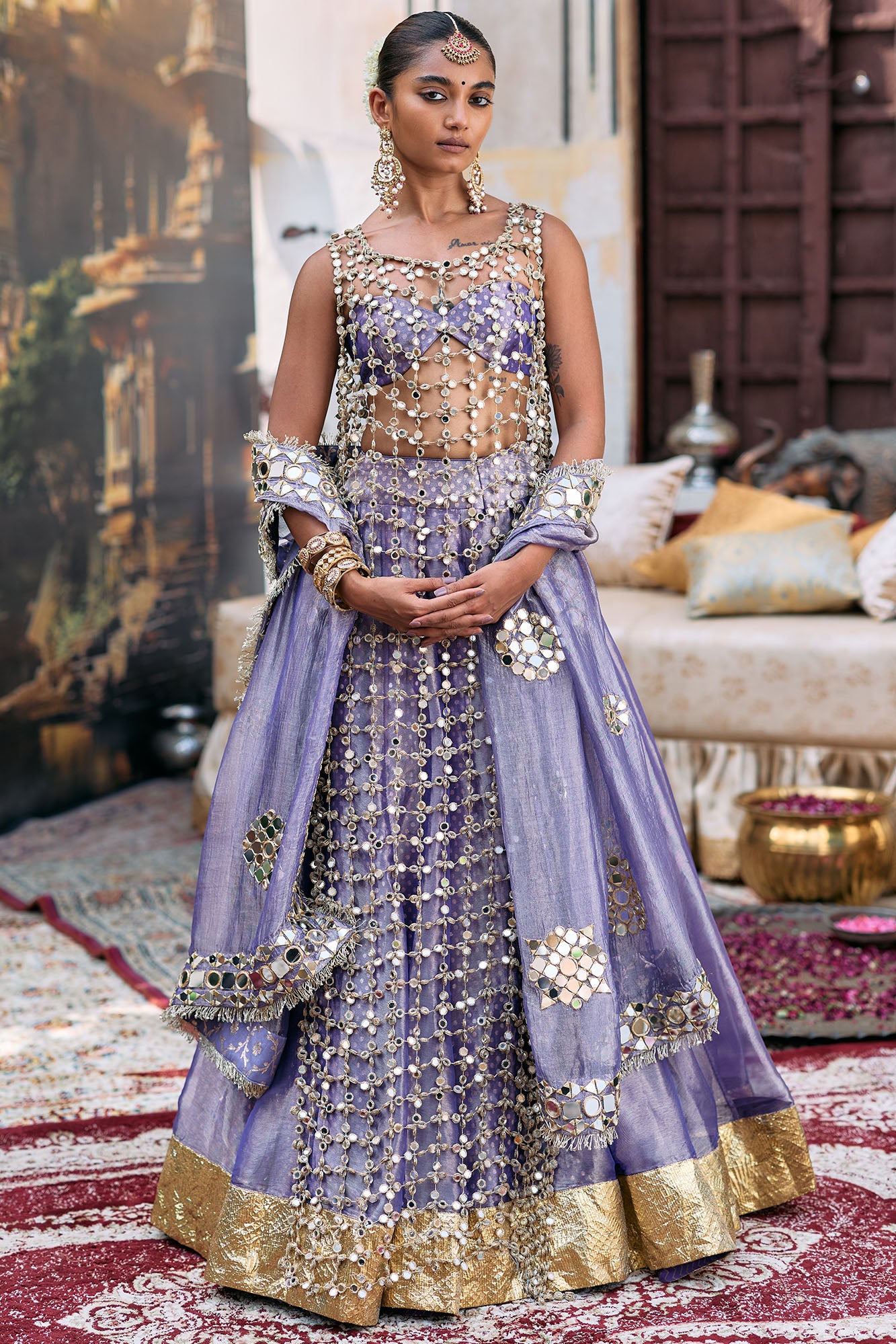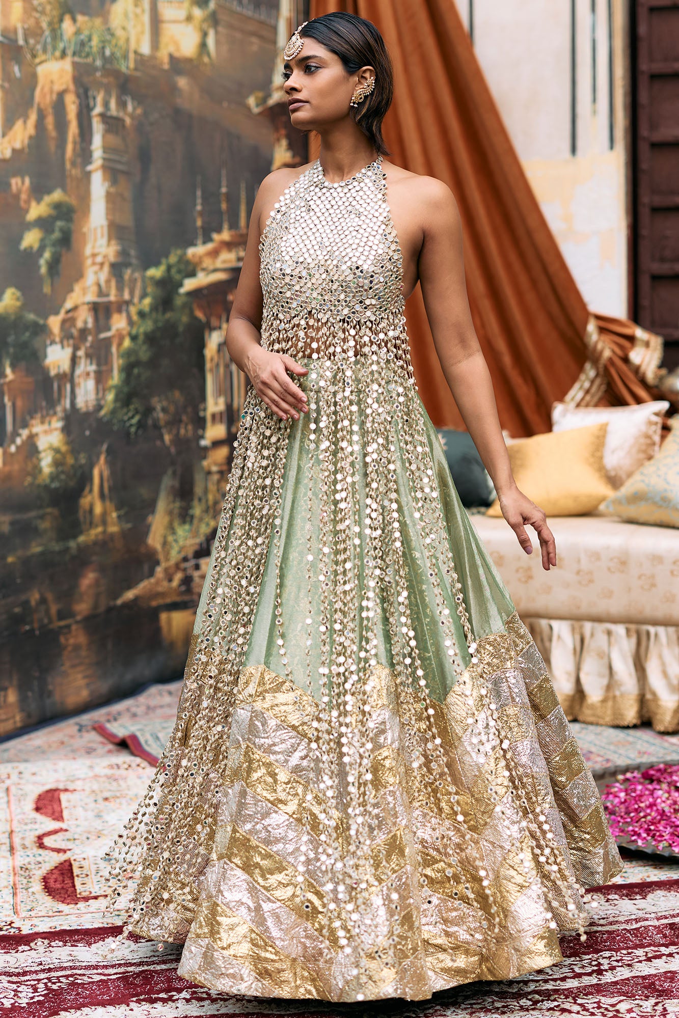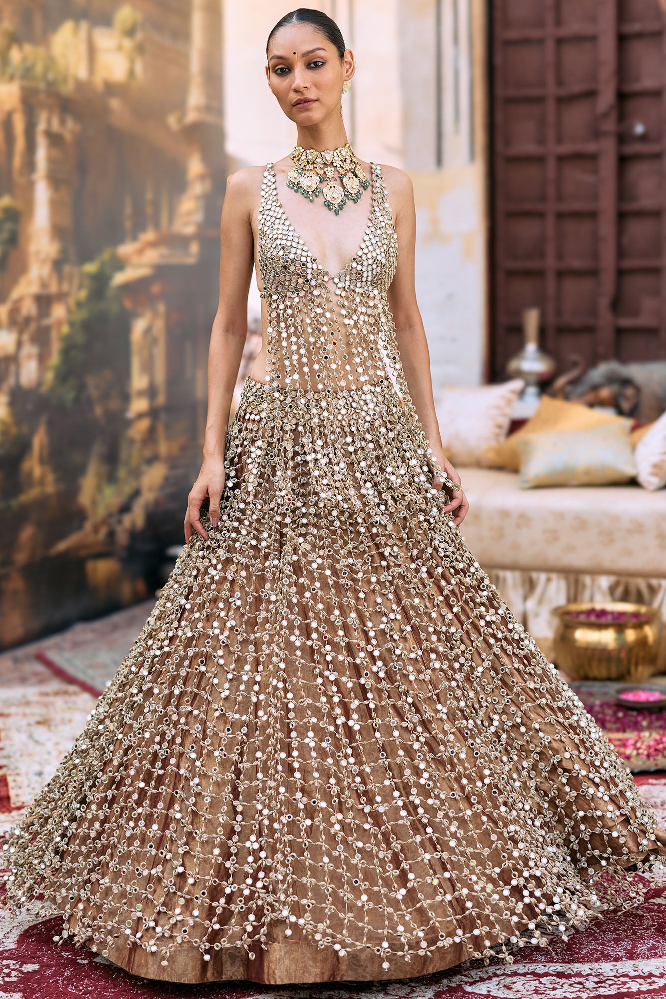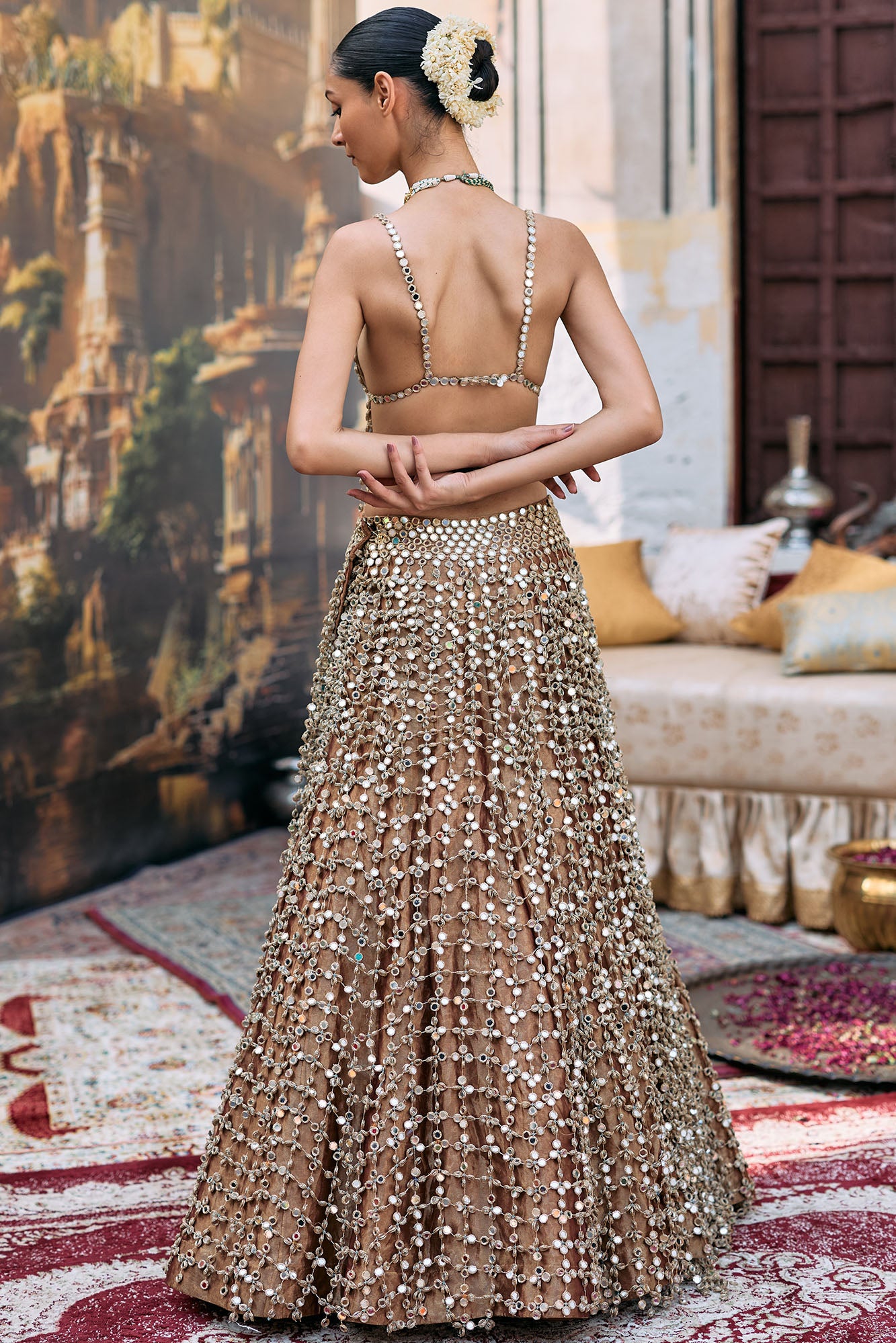 Seema Gujral Antique Gold Mirror Work Lehenga Set