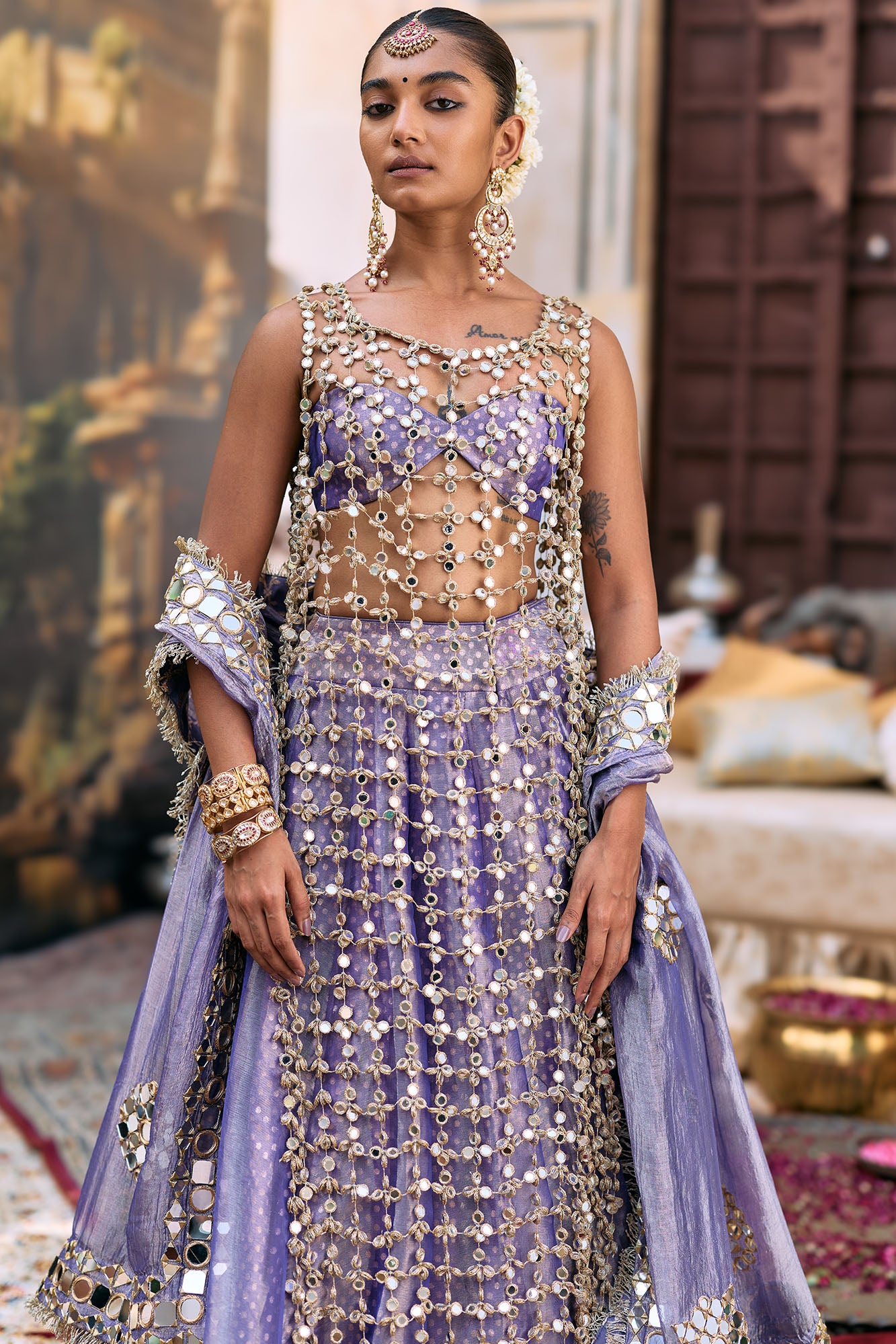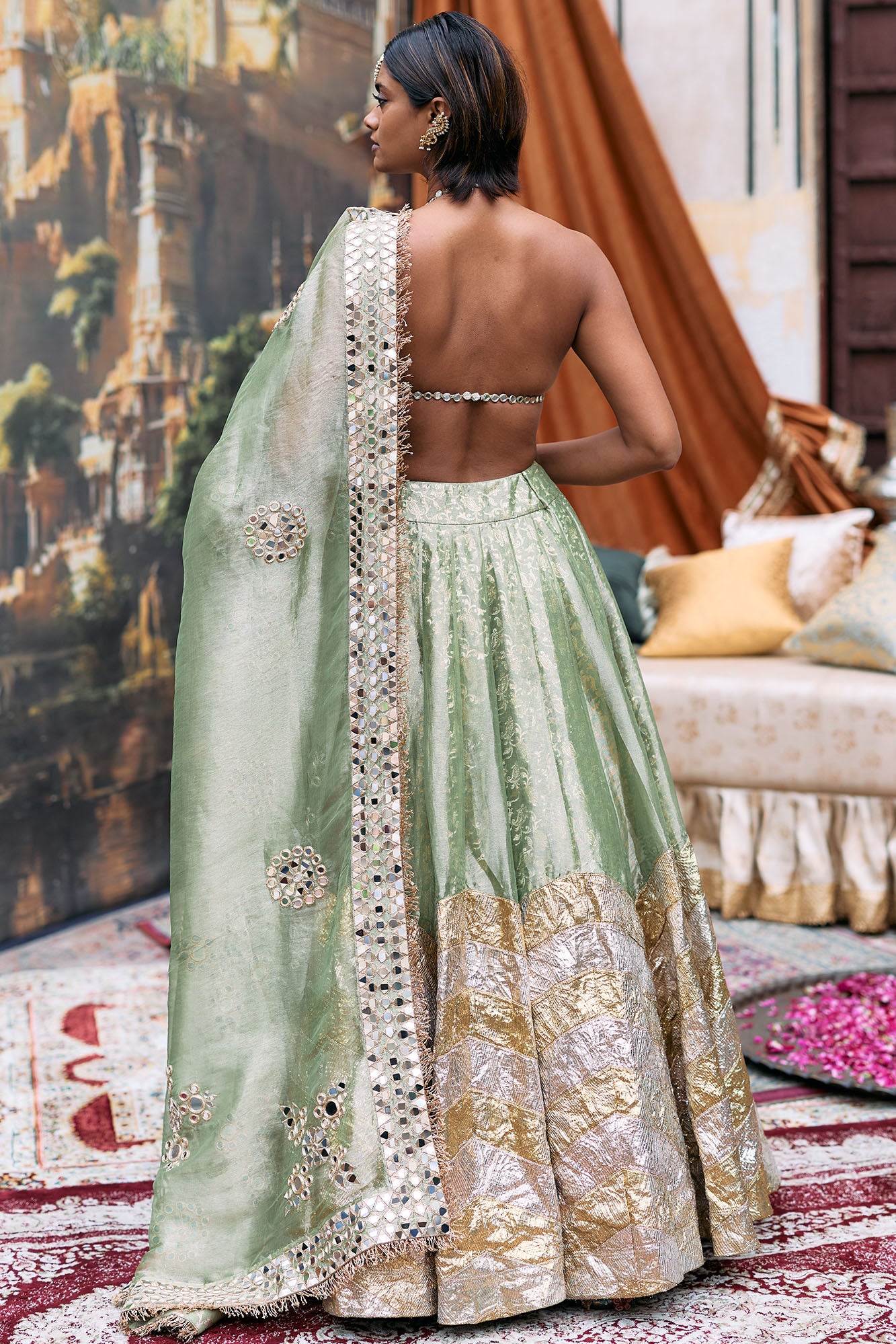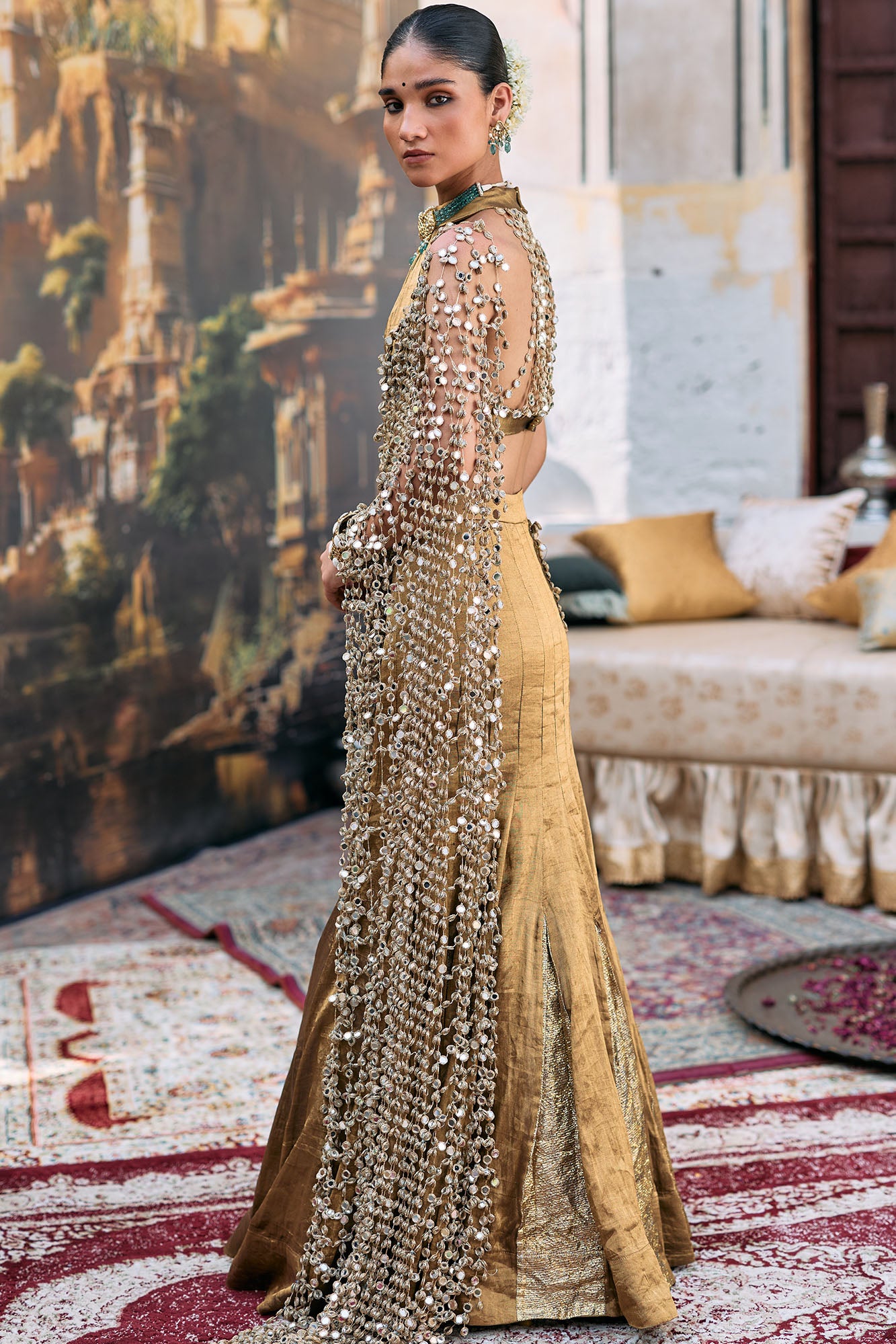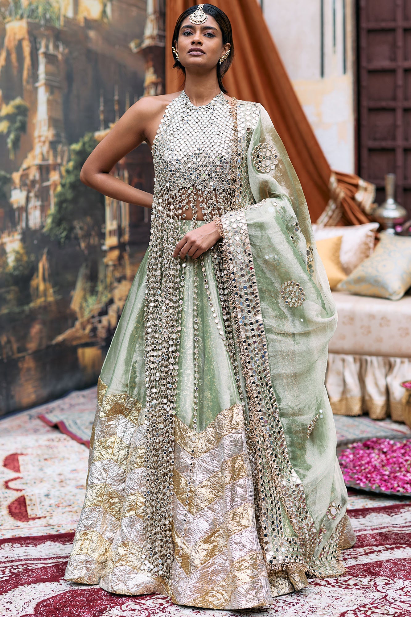 Seema Gujral Antique Gold Mirror Work Lehenga Set