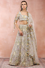 Off white georgette applique embroidered choli and lehenga with mukaish organza dupatta.