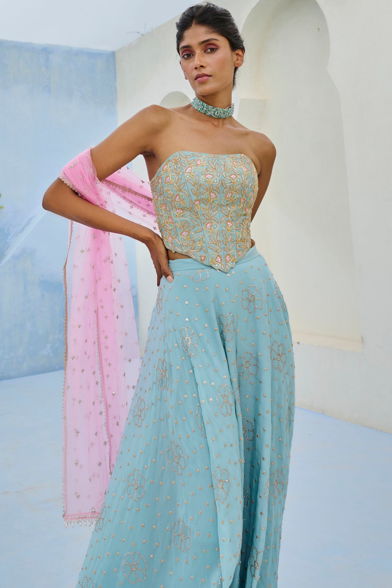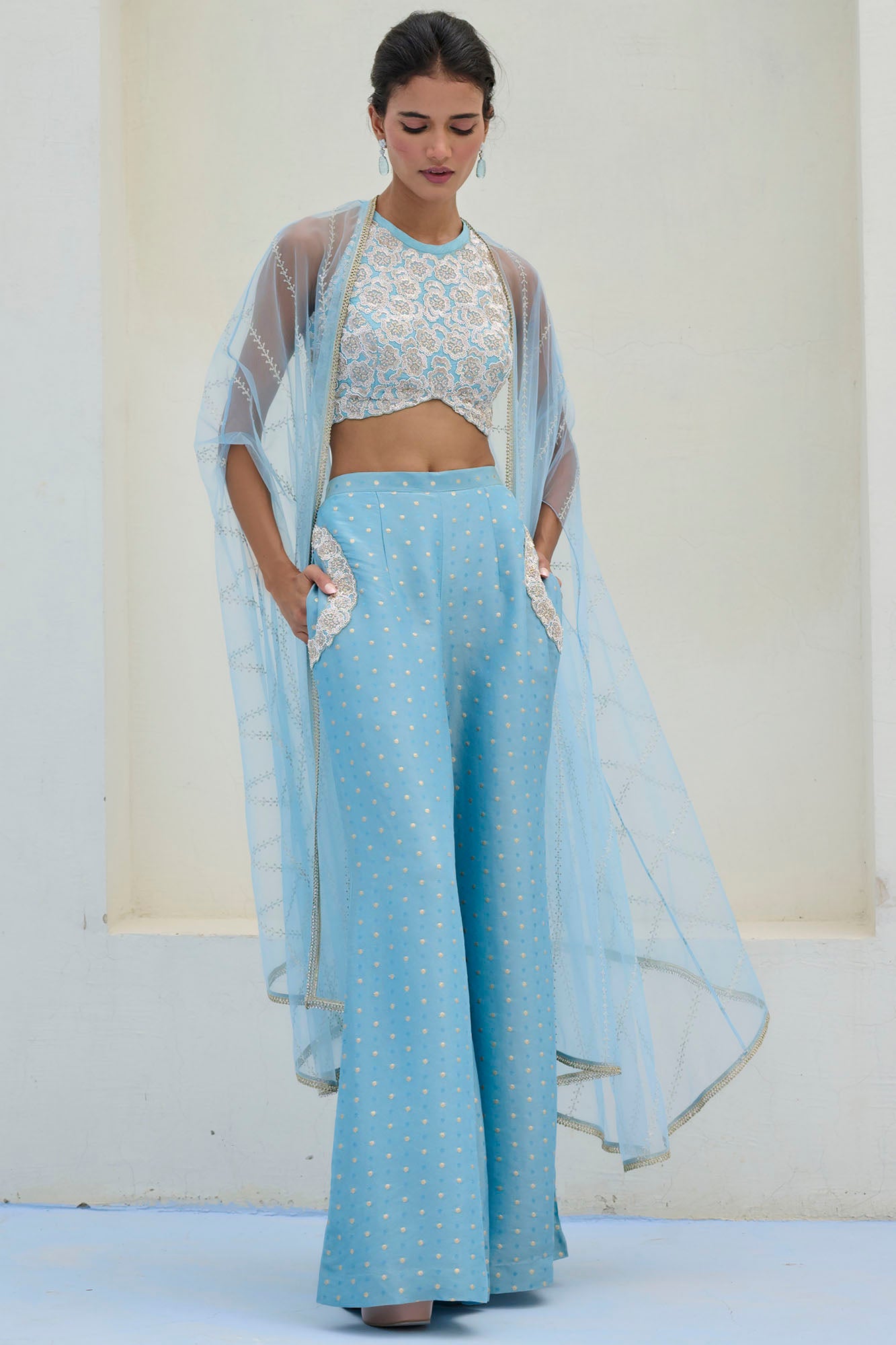 Best known for their colourful silhouettes, including lightweight lehengas, fusion cape sets and sarees