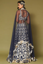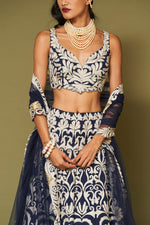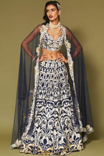 A midnight navy georgette lehenga set featuring intricate hand embroidery and fine zari work, paired with a matching embroidered blouse and an intricately embroidered net dupatta.