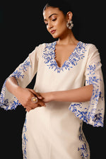 An ivory chanderi kurta set featuring cutwork detailing and resham embroidery with signature embroidered slit sleeves, paired with matching palazzo pants accented with block print and an embroidered silk organza dupatta.