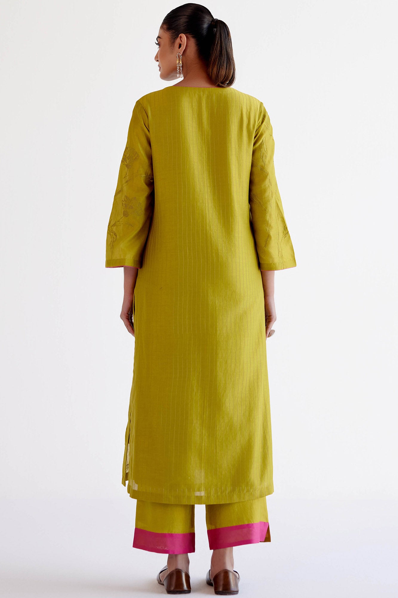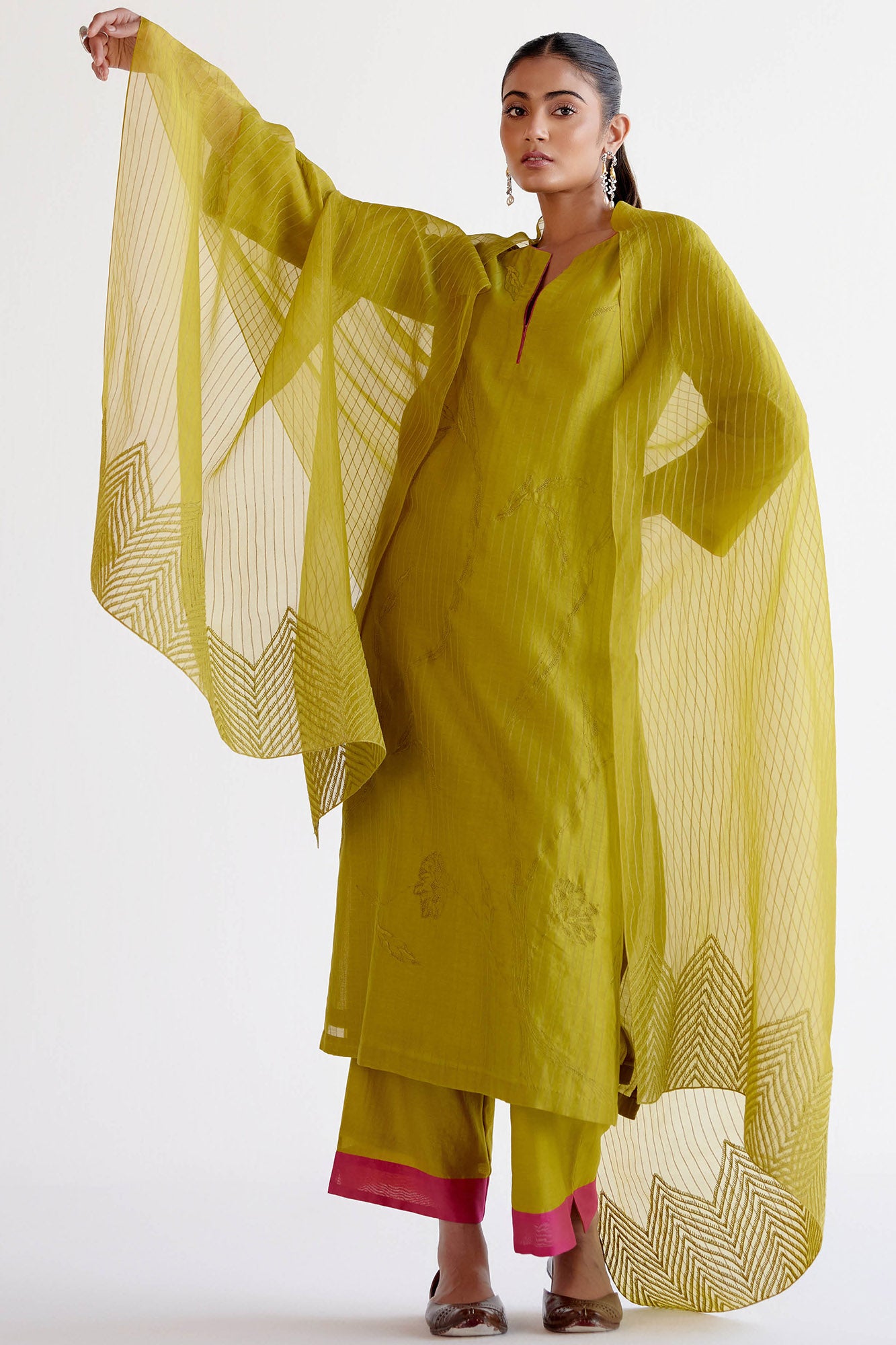 A green silk chanderi kurta set featuring intricate resham and dori embroidery, paired with a matching palazzo and an embroidered silk organza dupatta detailed with block print accents.
