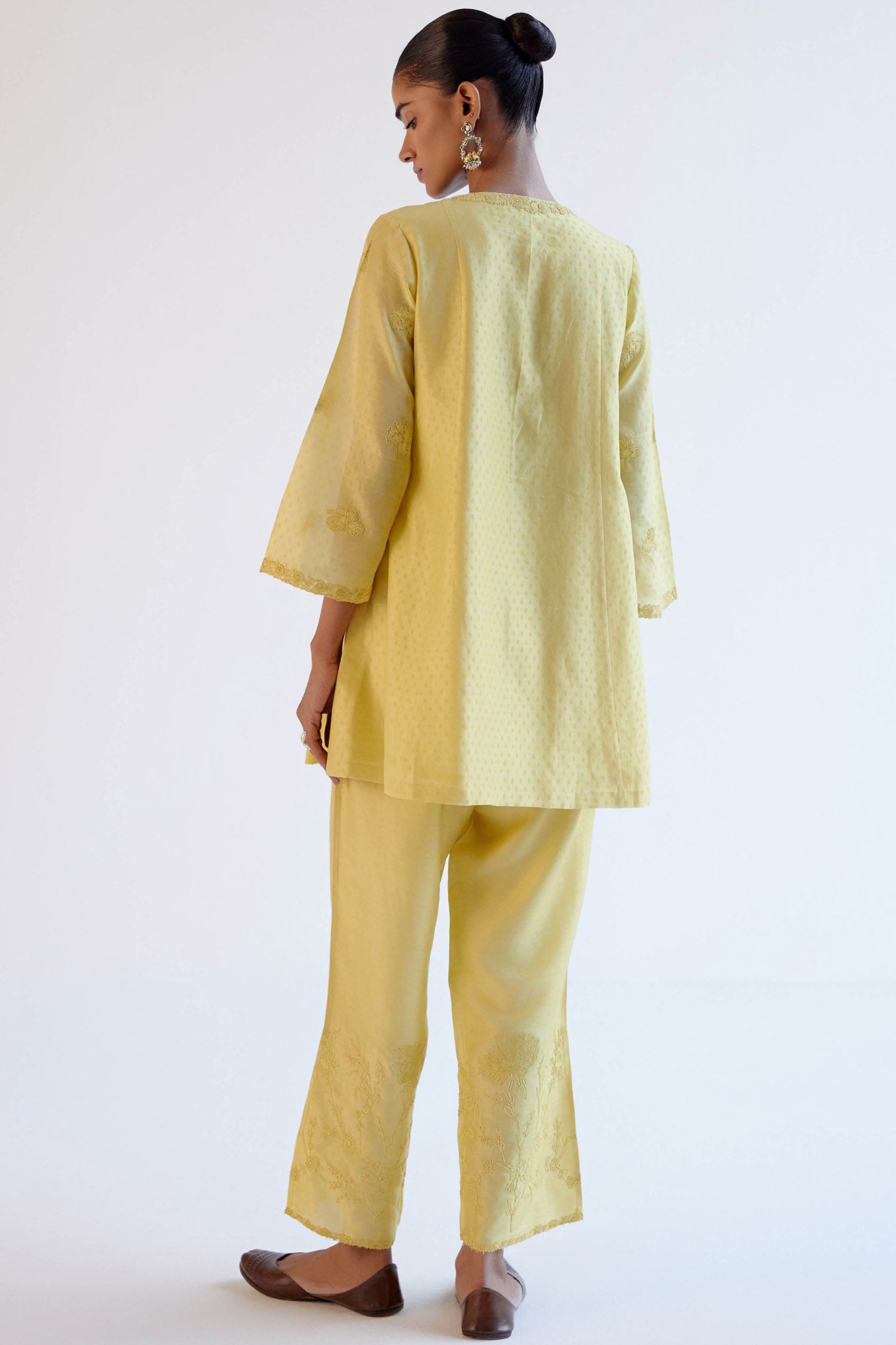 This Lemon yellow silk chanderi short kurta features intricate block print and exquisite resham and dori work embroidery. The kurta is paired with a matching embroidered palazzo and a stunning block-printed flowy silk dupatta, offering a perfect harmony of traditional art and contemporary allure.