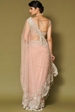 A blush pink net saree featuring intricate zari work and fine hand embroidery, paired with a matching net blouse adorned with coordinated embroidery.