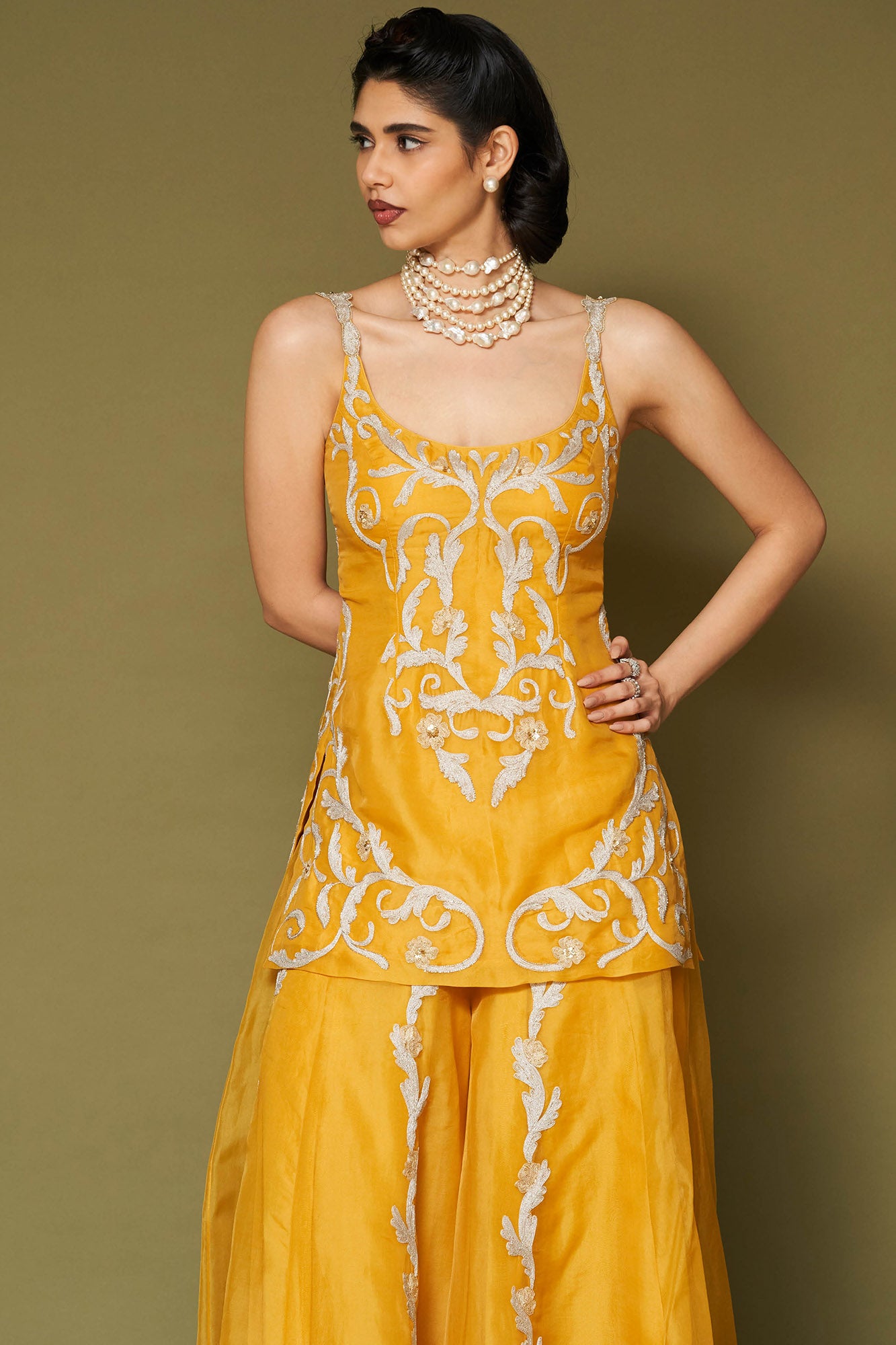 A bright yellow organza sharara set featuring fine zari work and delicate hand embroidery, paired with a fully embellished short kurta, a matching organza sharara, and a beautifully embellished net dupatta.