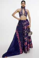 Make a statement this wedding season in our handwoven cutwork Banarasi lehenga, crafted in luxurious pure satin silk. In a regal purple hue, it features intricate motifs inspired by Oriental culture, while the blouse showcases a keyhole neckline with striking collar and cut details.