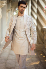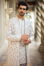 This open jacket features embroidery champagne zari on grey italian crepe base .It comes with an embroidered kurta and straight pants. Complementing footwear is also available.