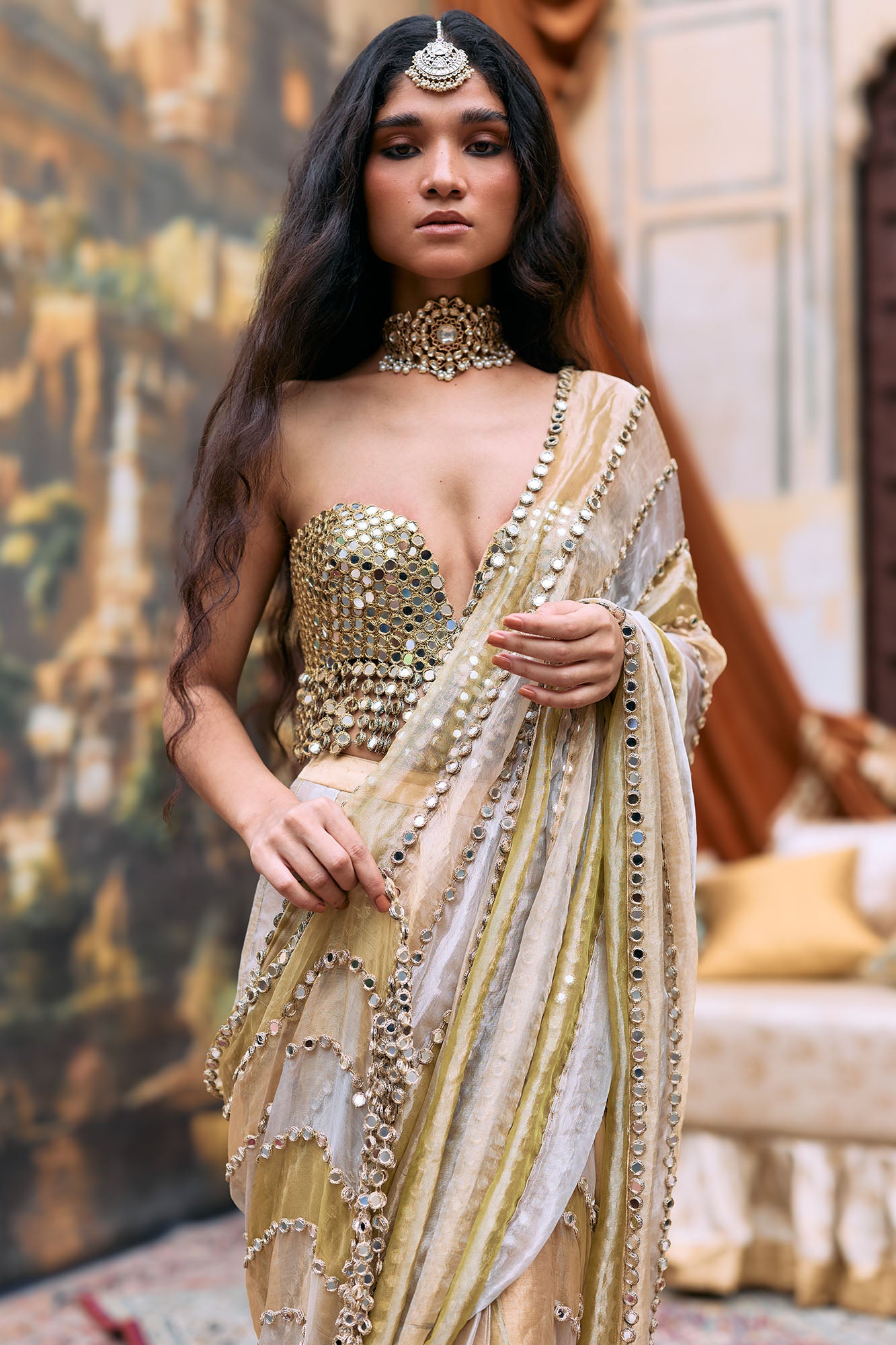 This is a pre-draped saree in silver, green, gold tissue stripes. It has a mirror lace detailing. The saree is paired with a mirror lace fringe corset.