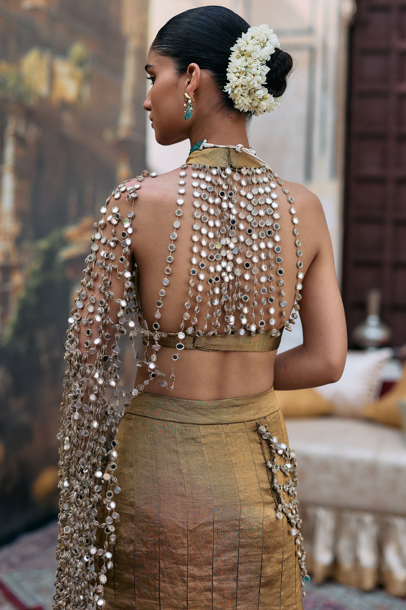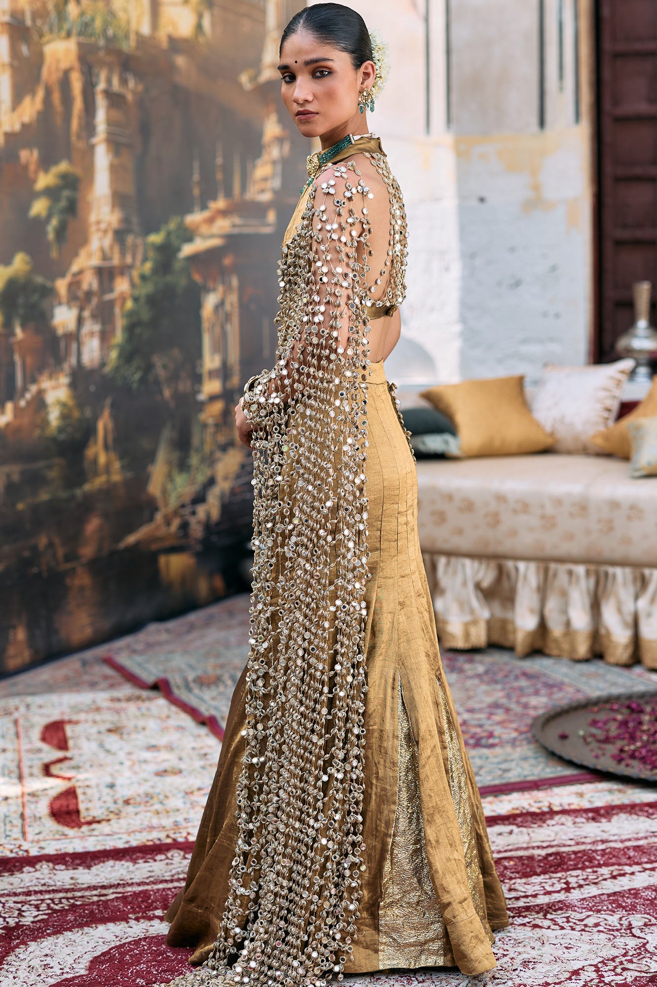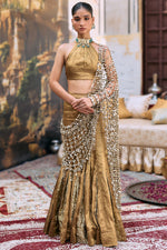 This fishtail lehenga is in bronze tissue with gold Gota detailing. It’s paired with a matching halter neck blouse with mirror jhalar detailing in the back. A mirror jaal attached palla completes the look.