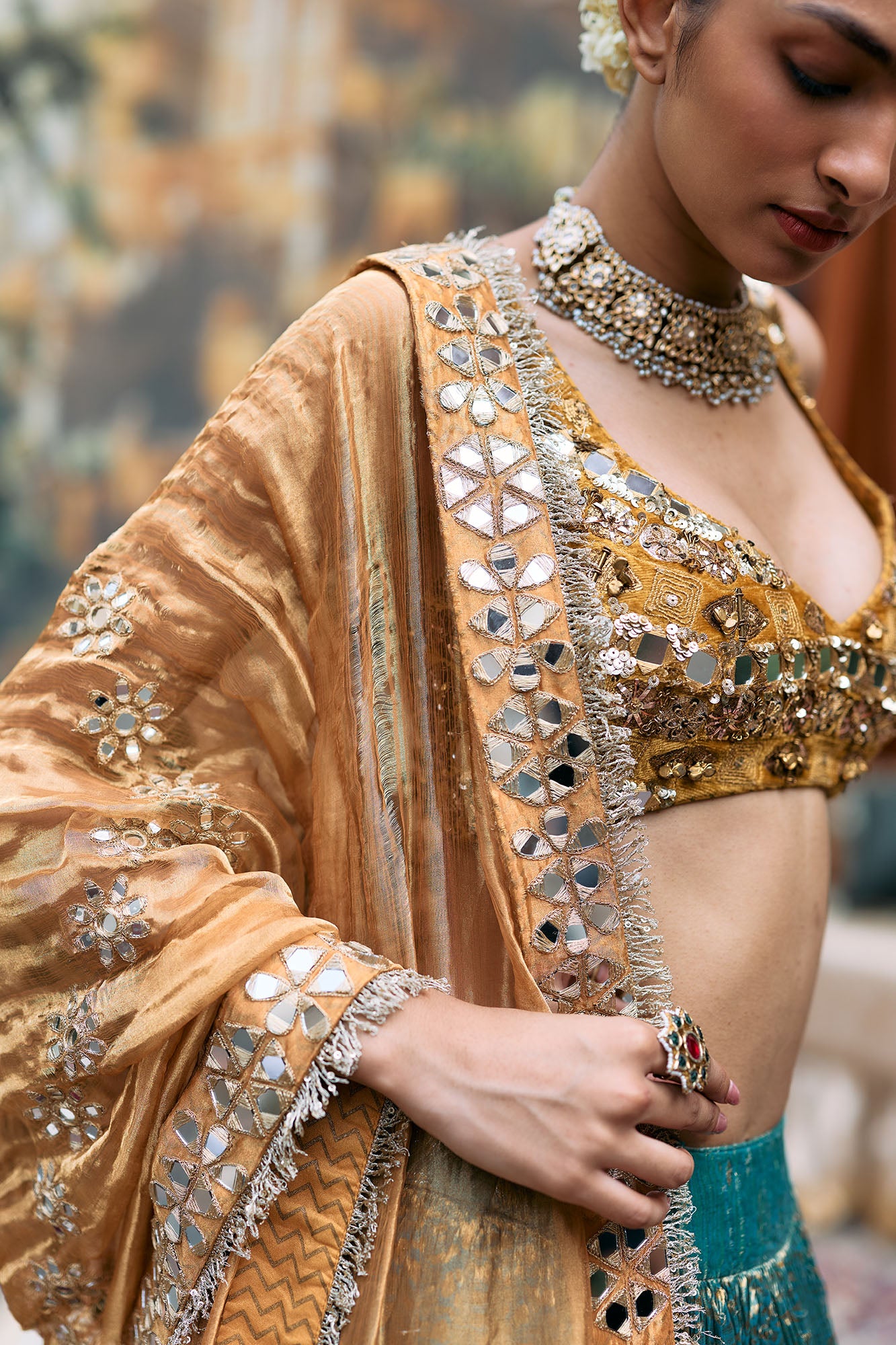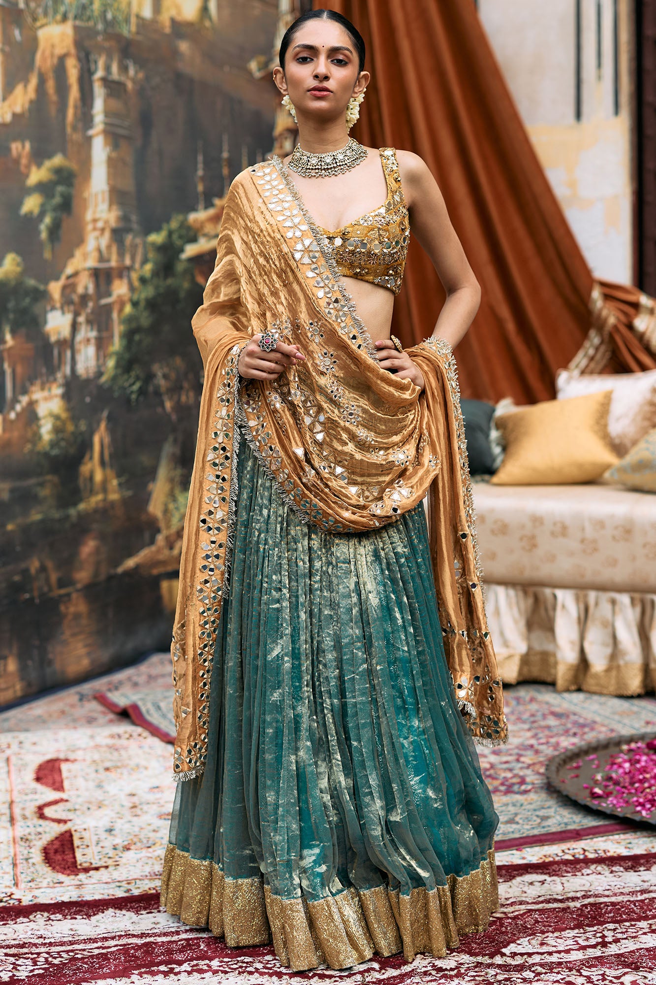 Teal tissue lehenga with a rich gold Gota border. Paired with an intricately hand embroidered yellow velvet blouse. Completed with a mustard tissue dupatta intricately hand embroidered with mirrors.