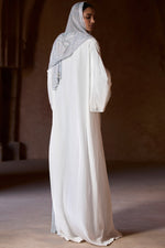 Silver crystal-embellished abaya paired with a solid fabric white shrug jacket and a matching crystal-embellished silver hijab.