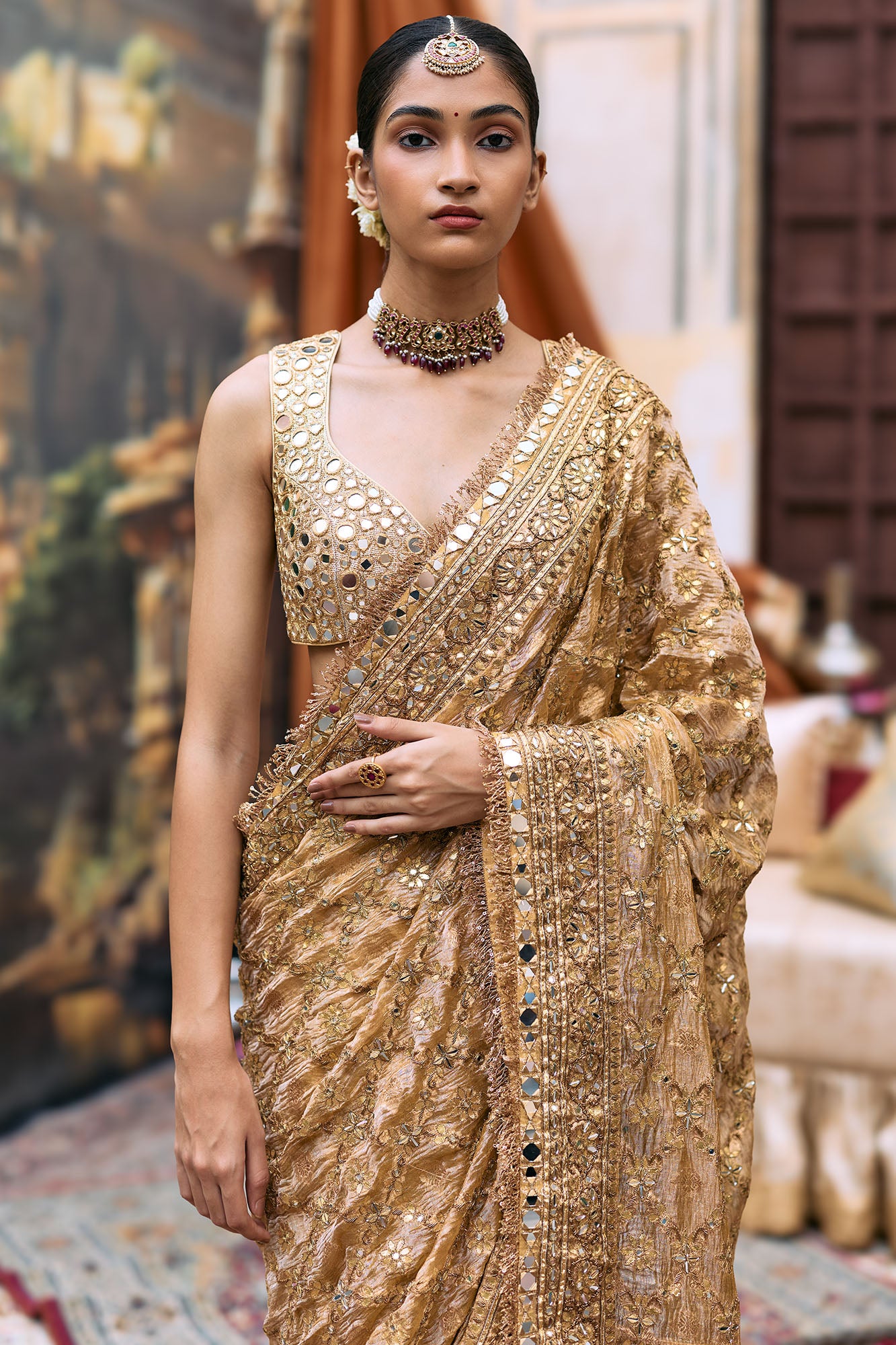 A luxurious crushed tissue saree adorned with intricate antique embroidery, complemented by our mirror blouse.