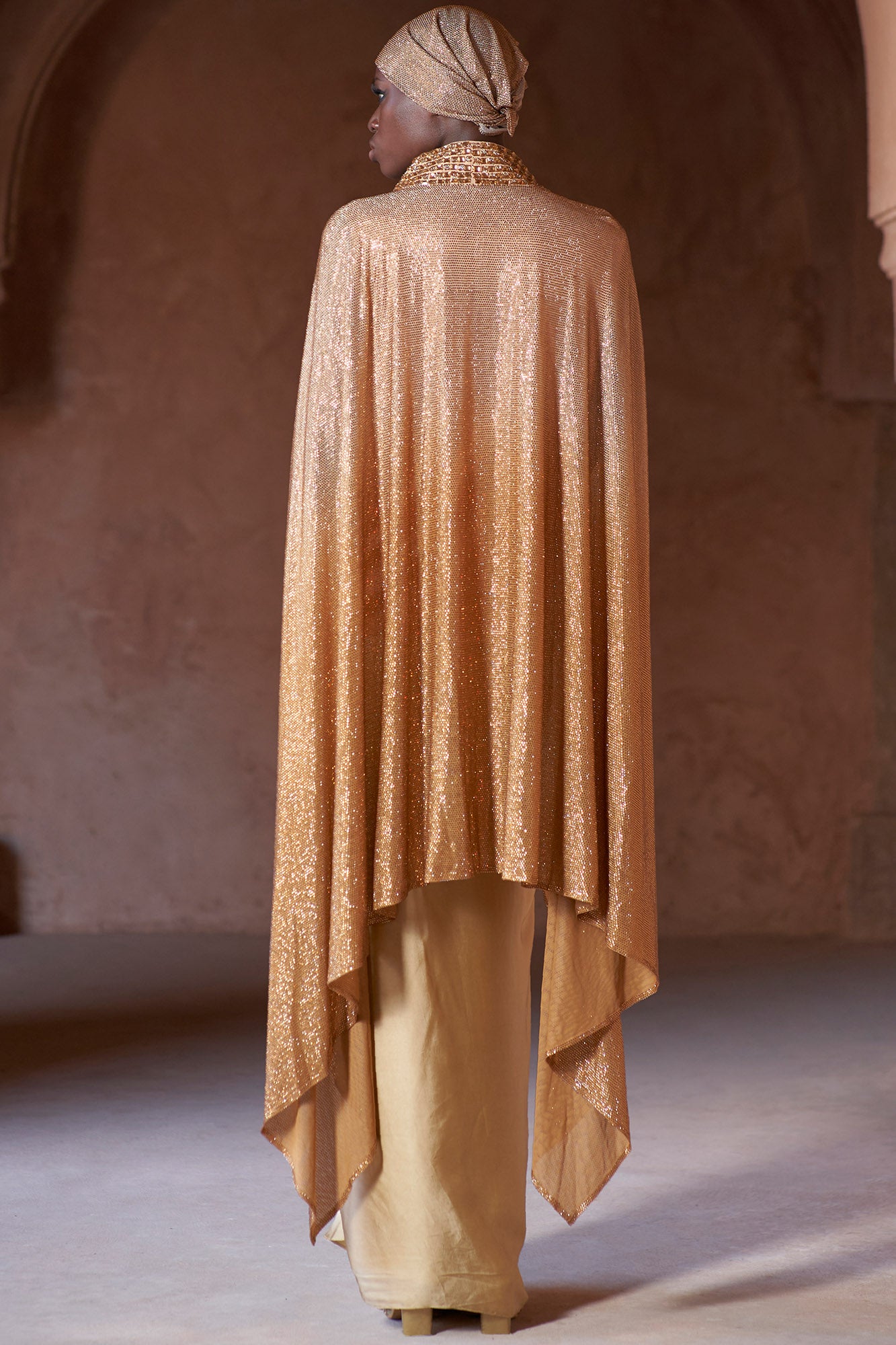 Light to dark gold ombre high-low tunic with a fully embellished yoke, paired with a draped satin skirt and a crepe slip along with a matching headgear accessory.