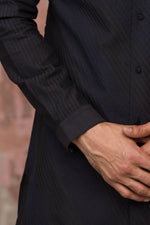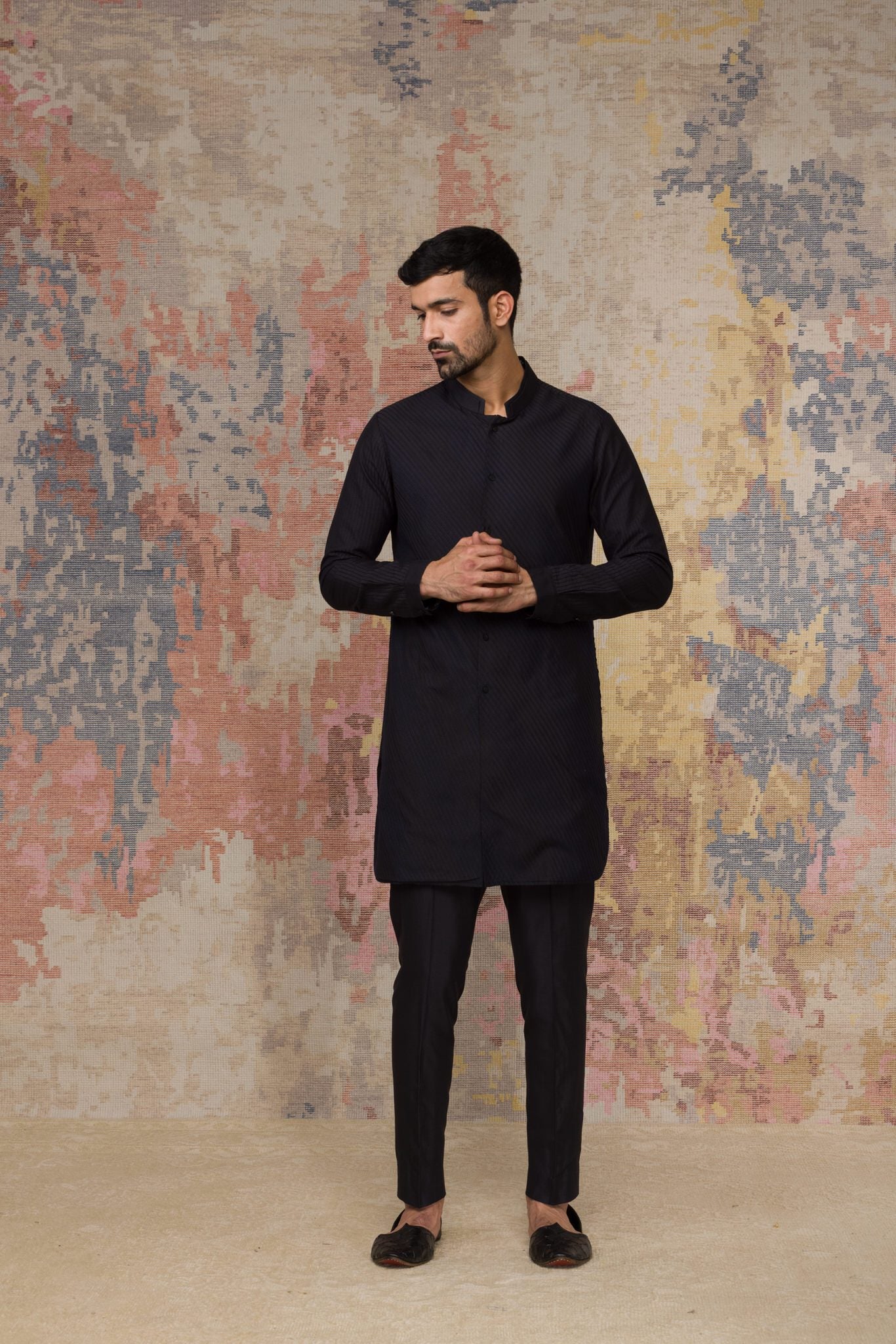 Featuring a black shirt kurta in cotton silk blend base, adorned with diagonal pin tuck and double collar. It has in seam pockets on both sides of the kurta. It is paired with cotton silk blend pants.