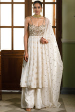 Fiza silk chikankari strapless anarkali with mukaish silk sharara and 3 dot mukaish organza dupatta.