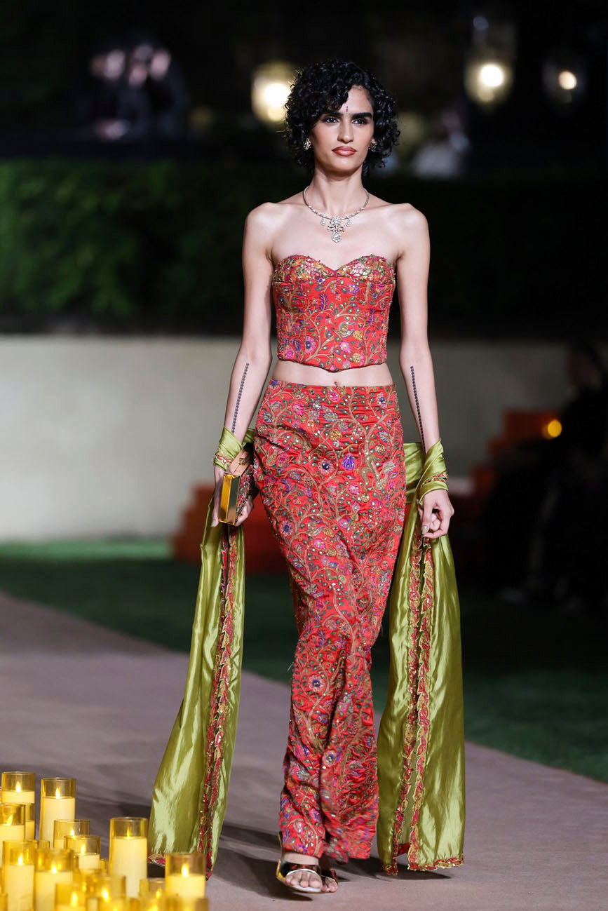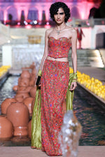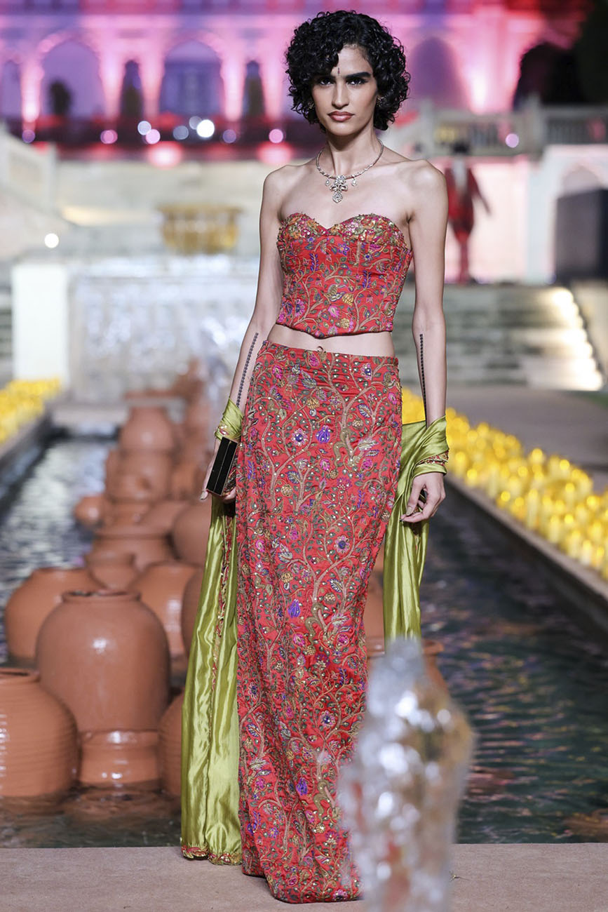 Bringing modernity to our ancient inspiration is is contemporary three-piece set featuring a straight worked skirt - an innovation on our draped sari silhouette- paired with coin embellished corset blouse ad rounding it up is an embroidered dupatta making this a look you can wear as a set but also just as easily as separates.