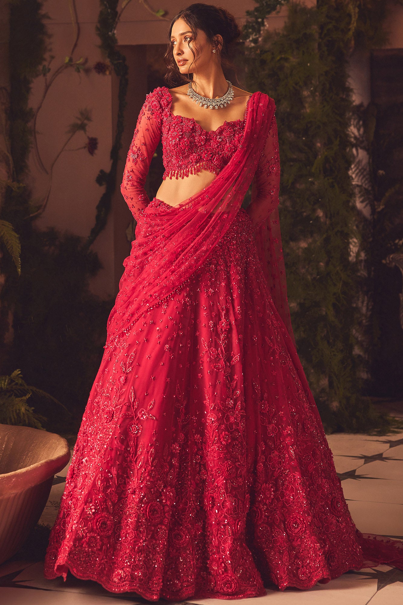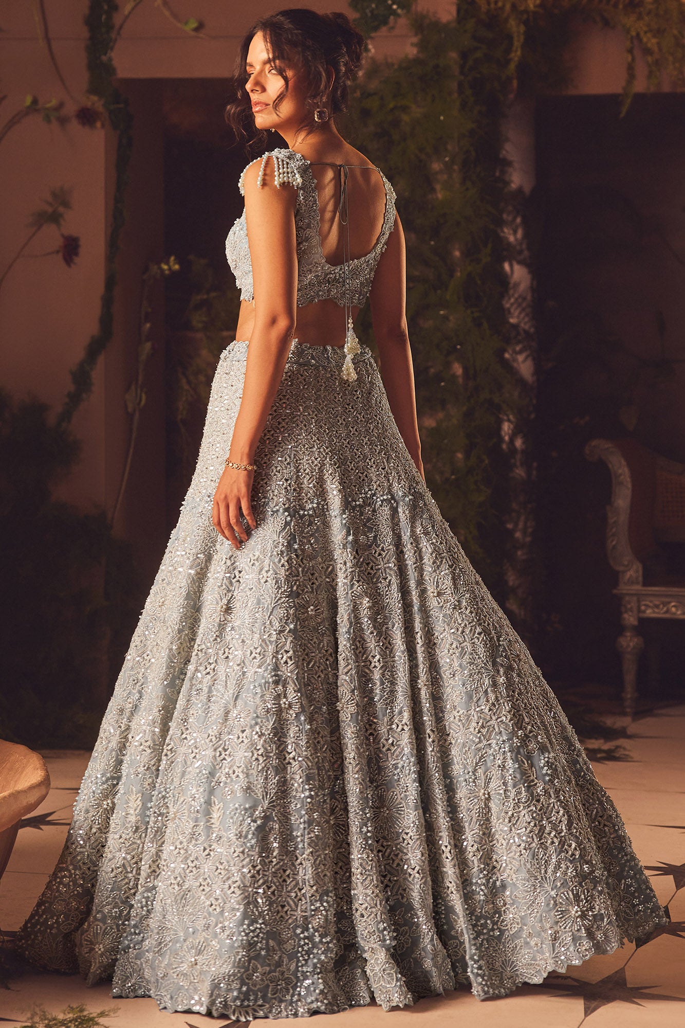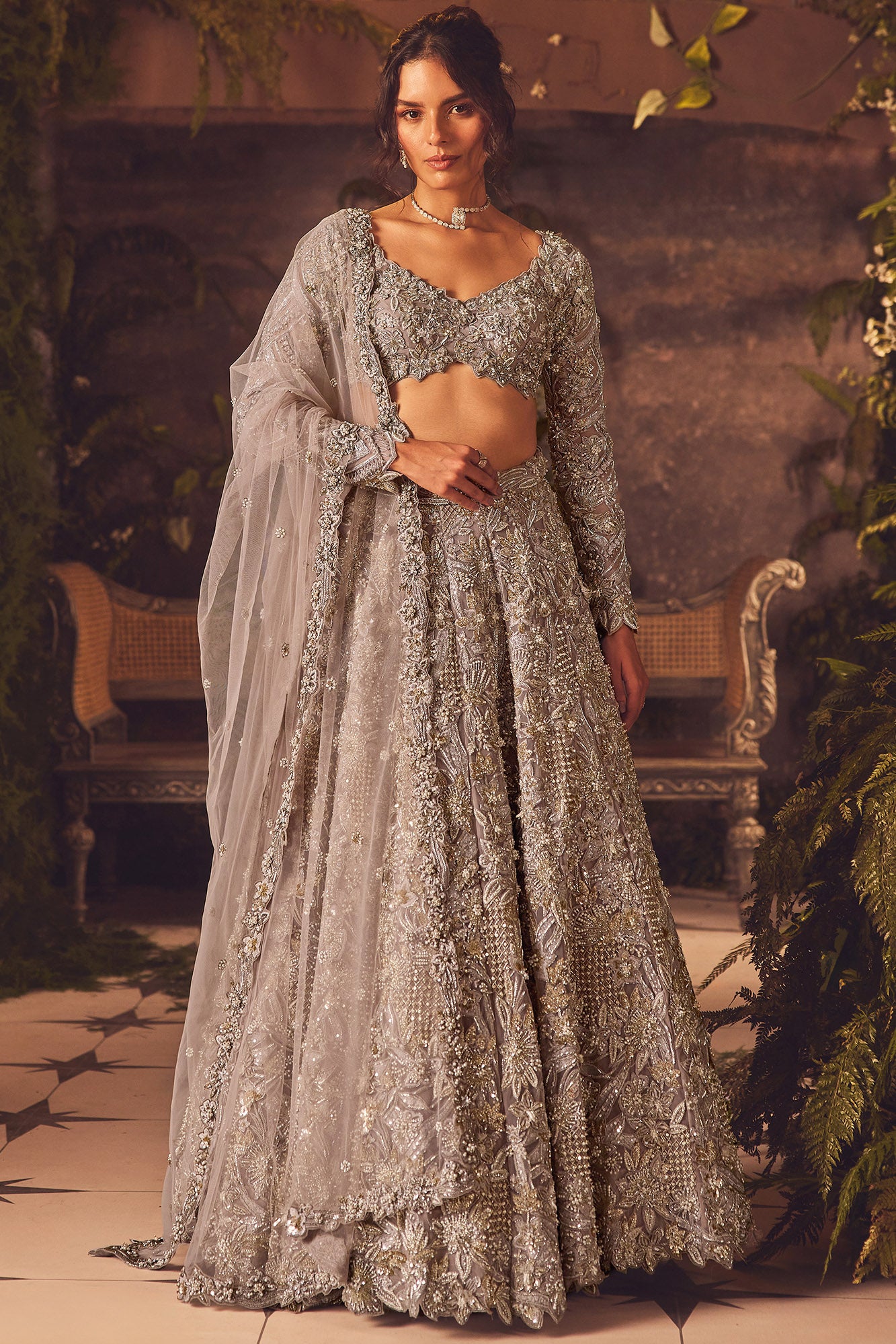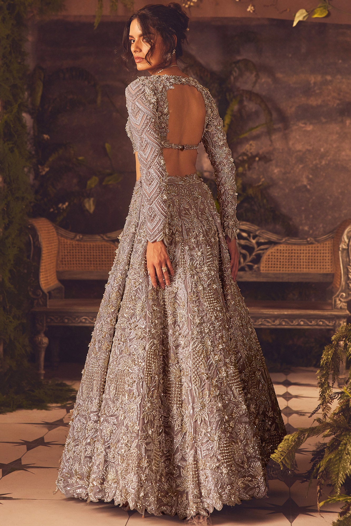 Best known for heritage and modern high-impact bridal silhouettes, with detailed ornamentation, including zardozi, sequins, cutdana, and bead embroidery