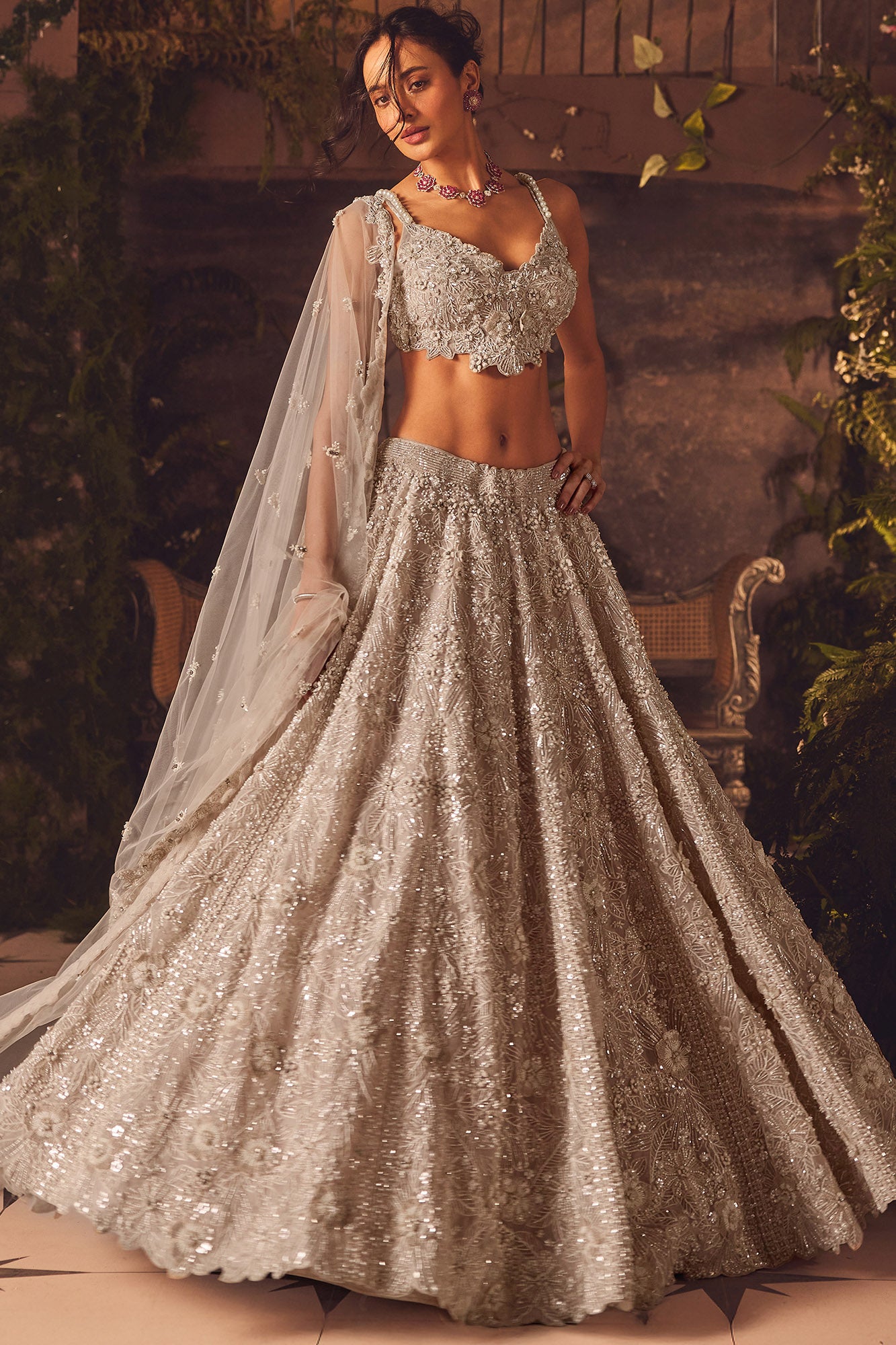 The Luminous lehenga set is a vision of modern romance. Showcasing Ethereal and exquisitely detailed handwork. The skirt is crafted on delicate organza, which flows with a soft elegance and is adorned with intricate 3D floral embroidery that adds texture and dimension to every step. The net blouse is thoughtfully designed with matching floral embellishments, offering a refined yet contemporary silhouette. Paired with a sheer net dupatta, gently scattered with embroidered blossoms, the ensemble exudes a weightless grace. Every fabric in The Gilded Gala is chosen to capture the ethereal glow of golden evenings.Â
