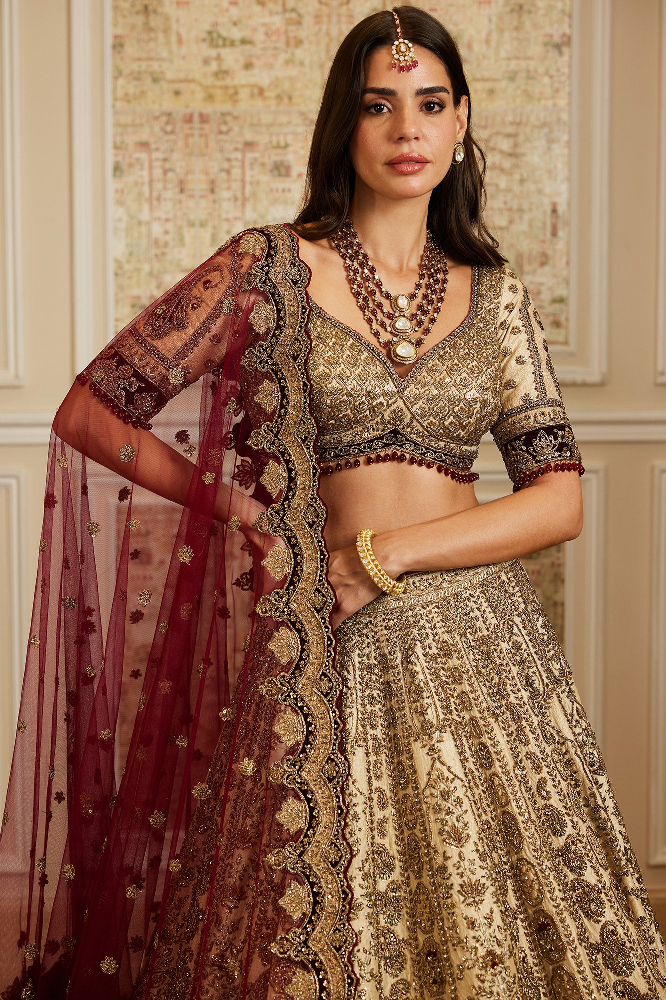 Ever After is an ode to love’s most sacred promise - the moment when two souls choose forever. A regal Mahran ensemble that embodies timeless grandeur, this ensemble is hand crafted on pure raw silk skirt, its natural sheen enriched with intricate zardozi and resham embroidery. The raw silk blouse adds richness and structure, adorned with hand-embellished details that mirror the lehenga’s ornate craftsmanship. The look is elevated with a net dupatta, bordered with scalloped zardozi work and delicate sequins, lending a touch of ethereal lightness to the otherwise opulent silhouette.