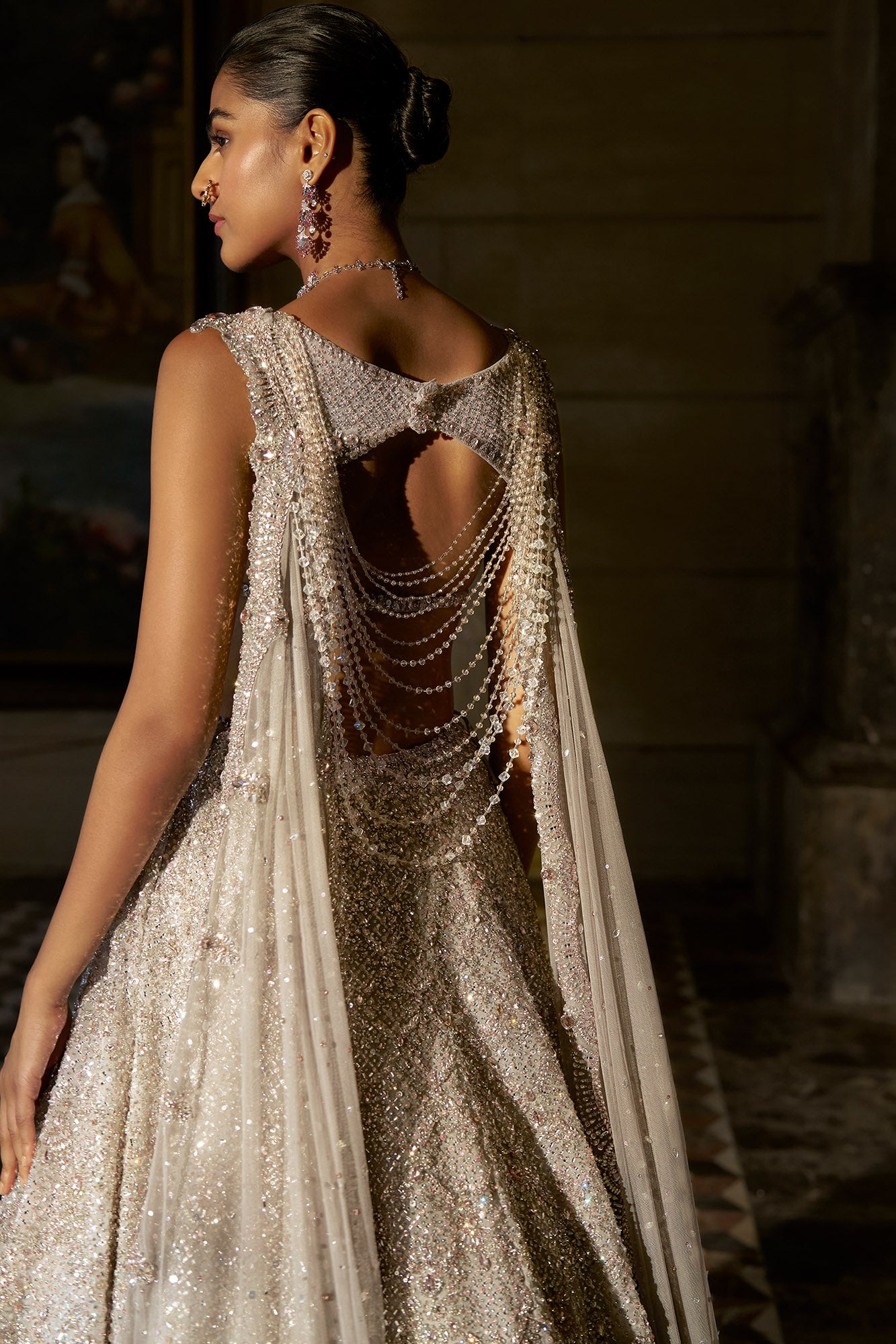 Best known for high-glamour bridal lehengas, gowns and occasion wear, featuring intricate sequins, mirror work and floral motifs. High visual impact and opulent couture