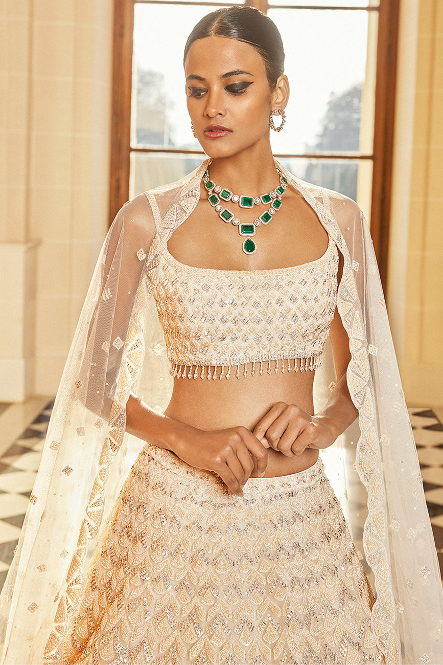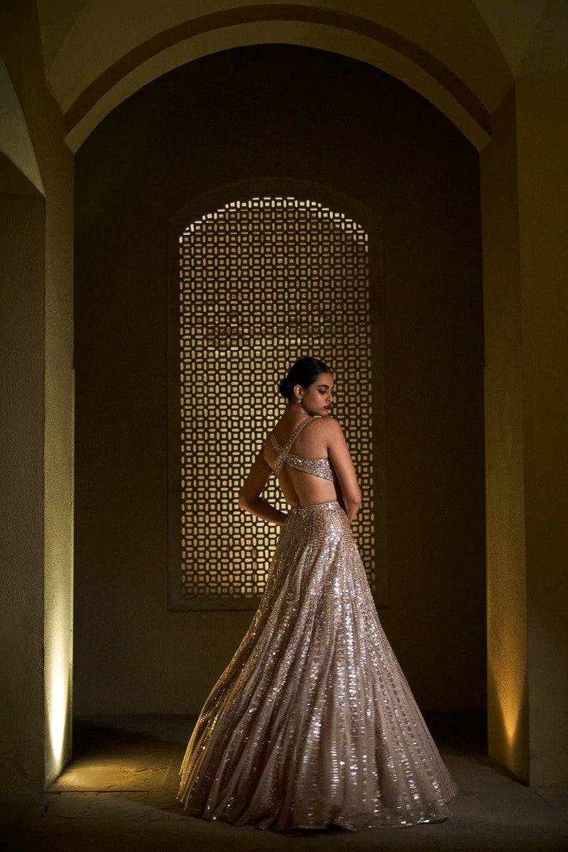 Best known for high-glamour bridal lehengas, gowns and occasion wear, featuring intricate sequins, mirror work and floral motifs. High visual impact and opulent couture
