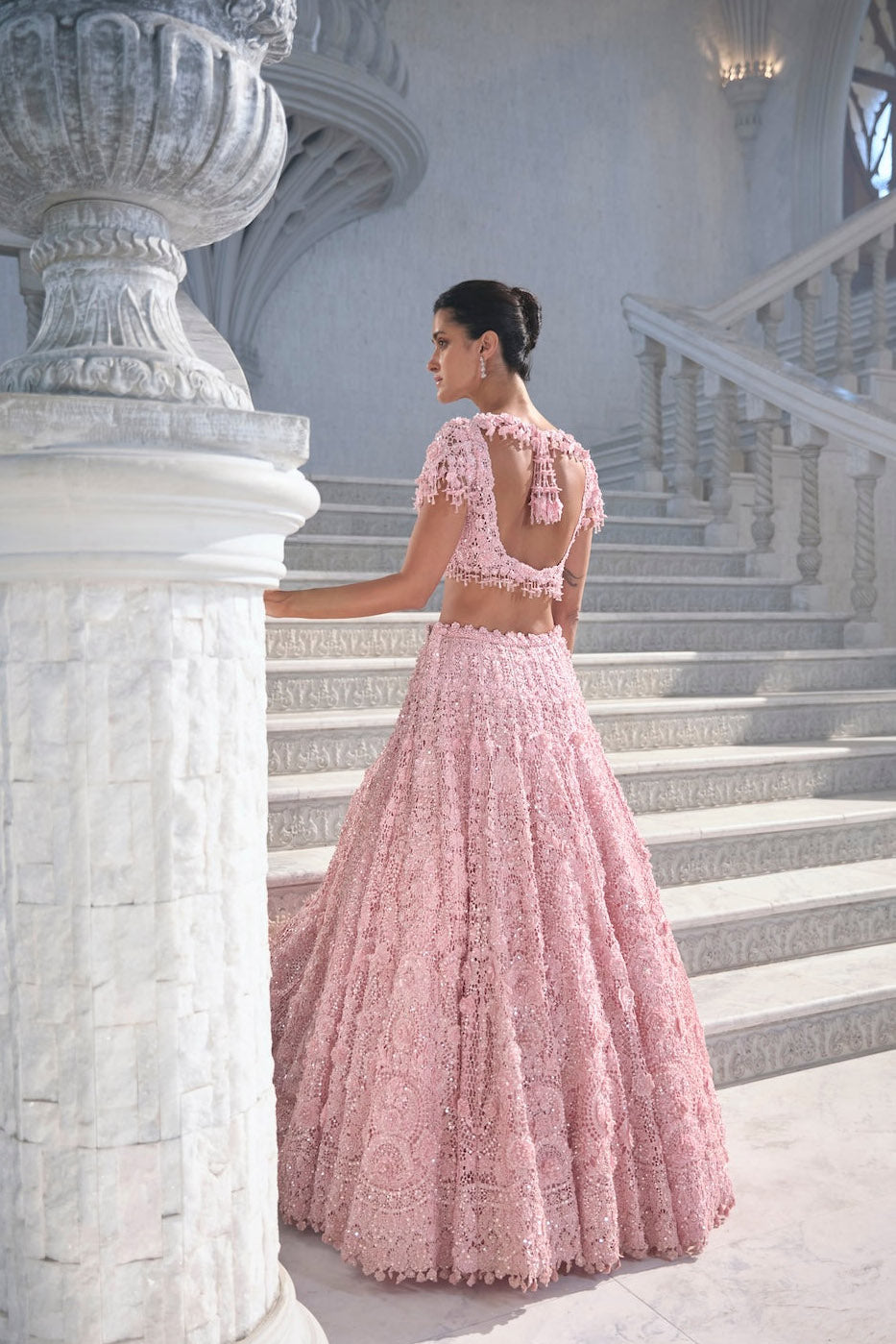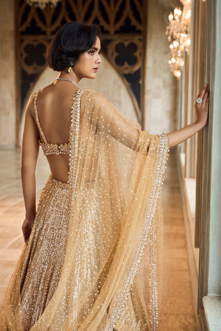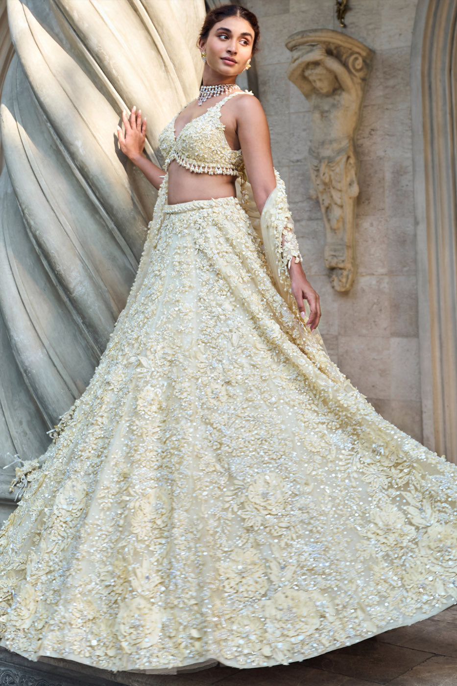 Best known for high-glamour bridal lehengas, gowns and occasion wear, featuring intricate sequins, mirror work and floral motifs. High visual impact and opulent couture