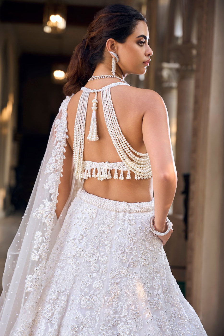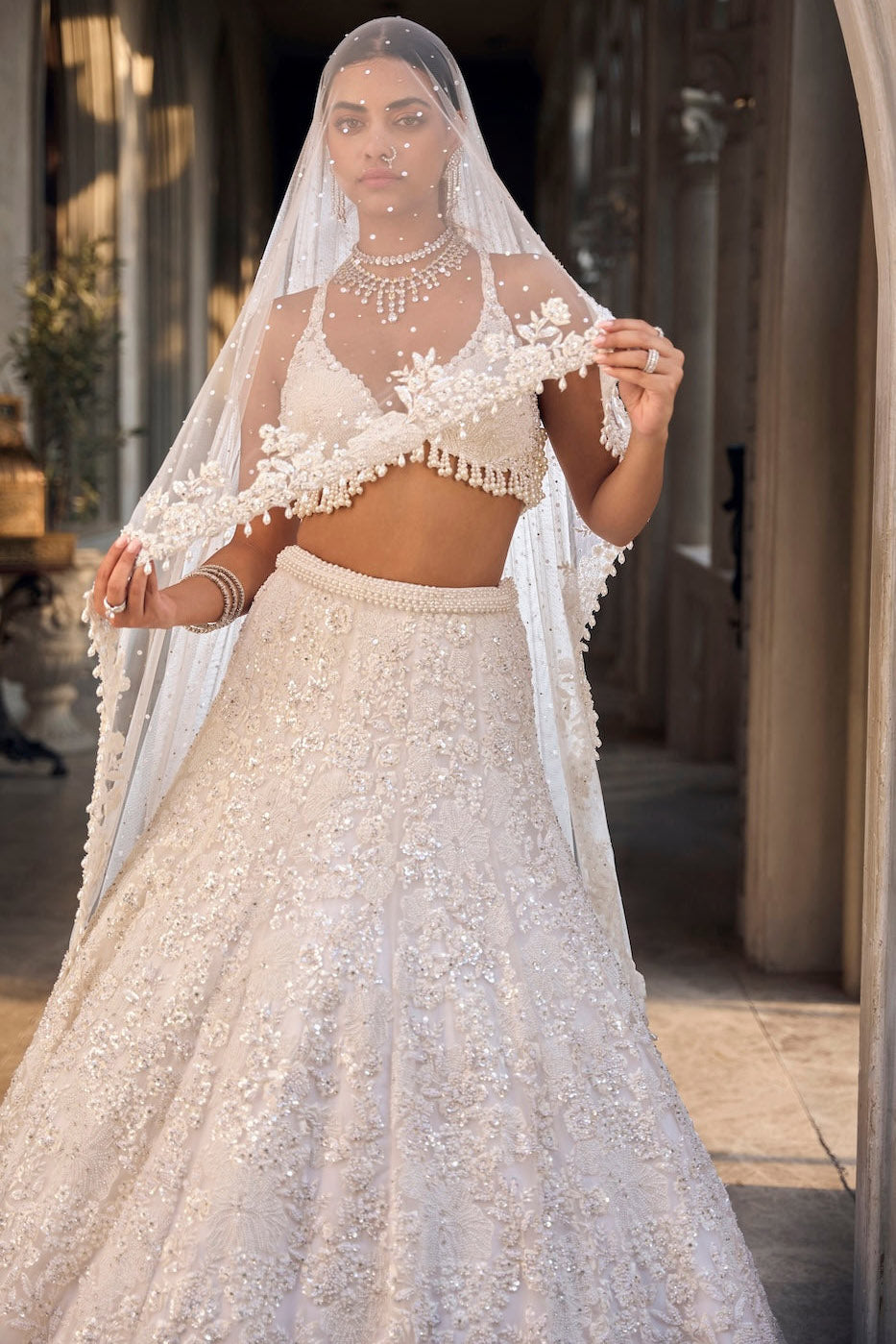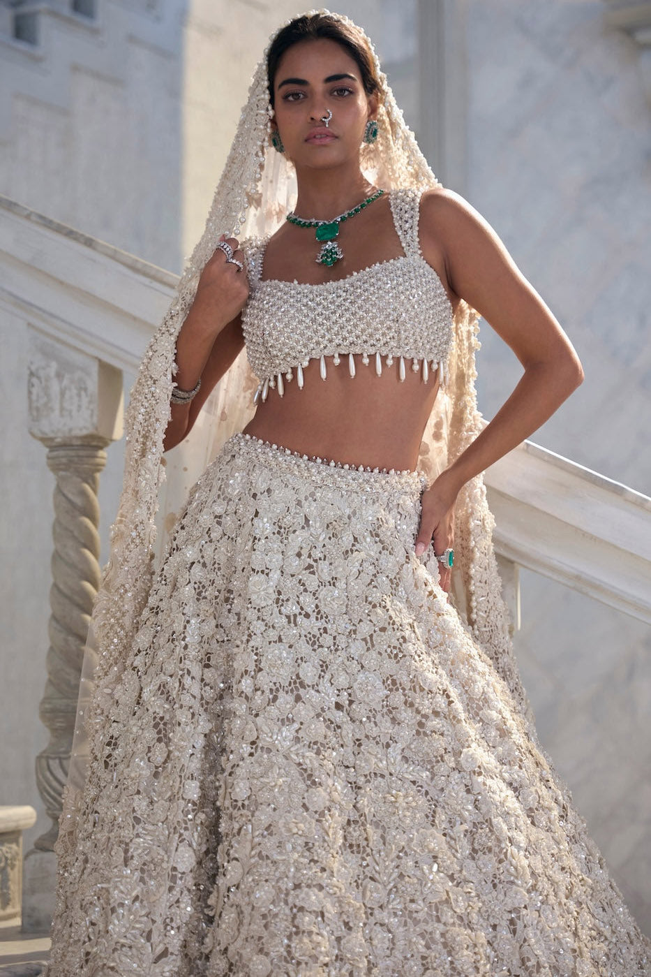 Best known for high-glamour bridal lehengas, gowns and occasion wear, featuring intricate sequins, mirror work and floral motifs. High visual impact and opulent couture
