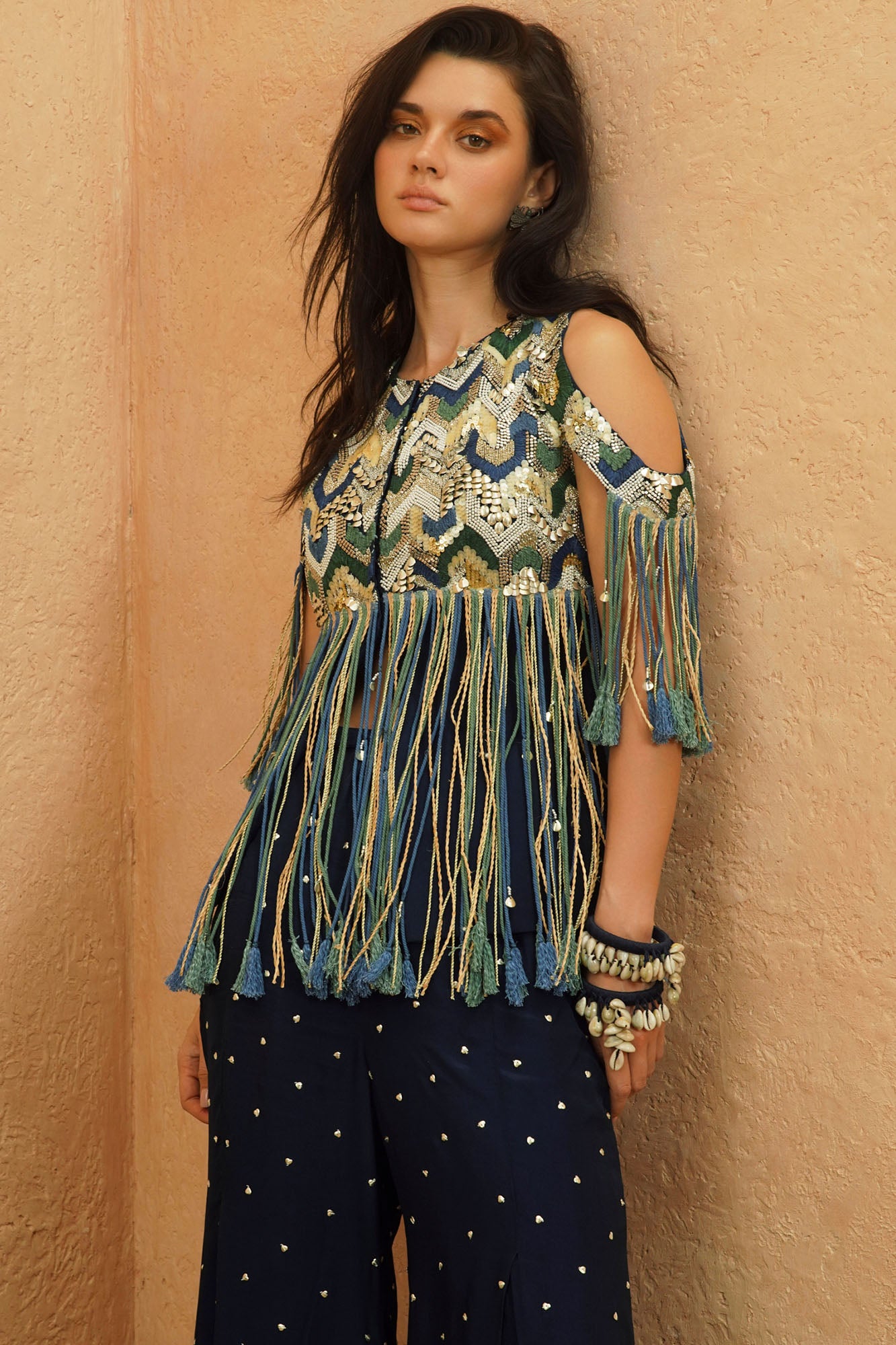 A striking ensemble featuring a cold-shoulder jacket with intricate embellishments and playful fringe details, paired with pleated flared pants adorned with delicate accents. The mix of textures and movement adds a bold, bohemian-chic vibe.