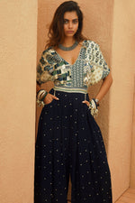 A striking navy jumpsuit featuring an intricately hand-embellished patchwork bodice with a mix of textures, metallic work, and bead detailing. The flowy wide-leg silhouette is adorned with delicate sequins, adding a touch of understated glamour to this fusion ensemble.