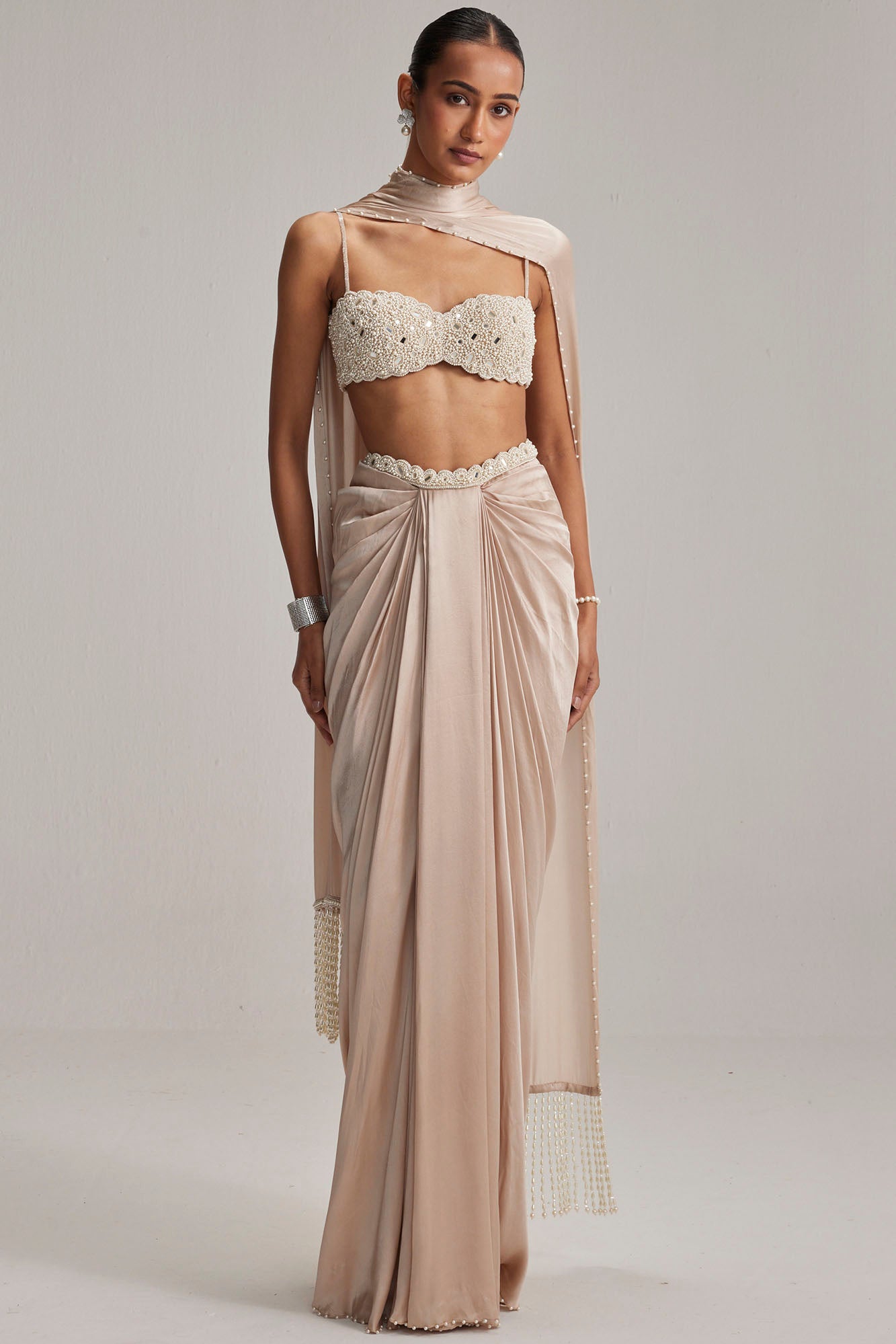Light Beige Satin Draped Skirt Set