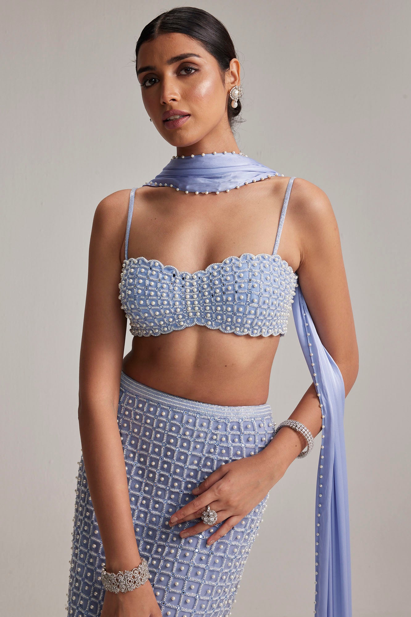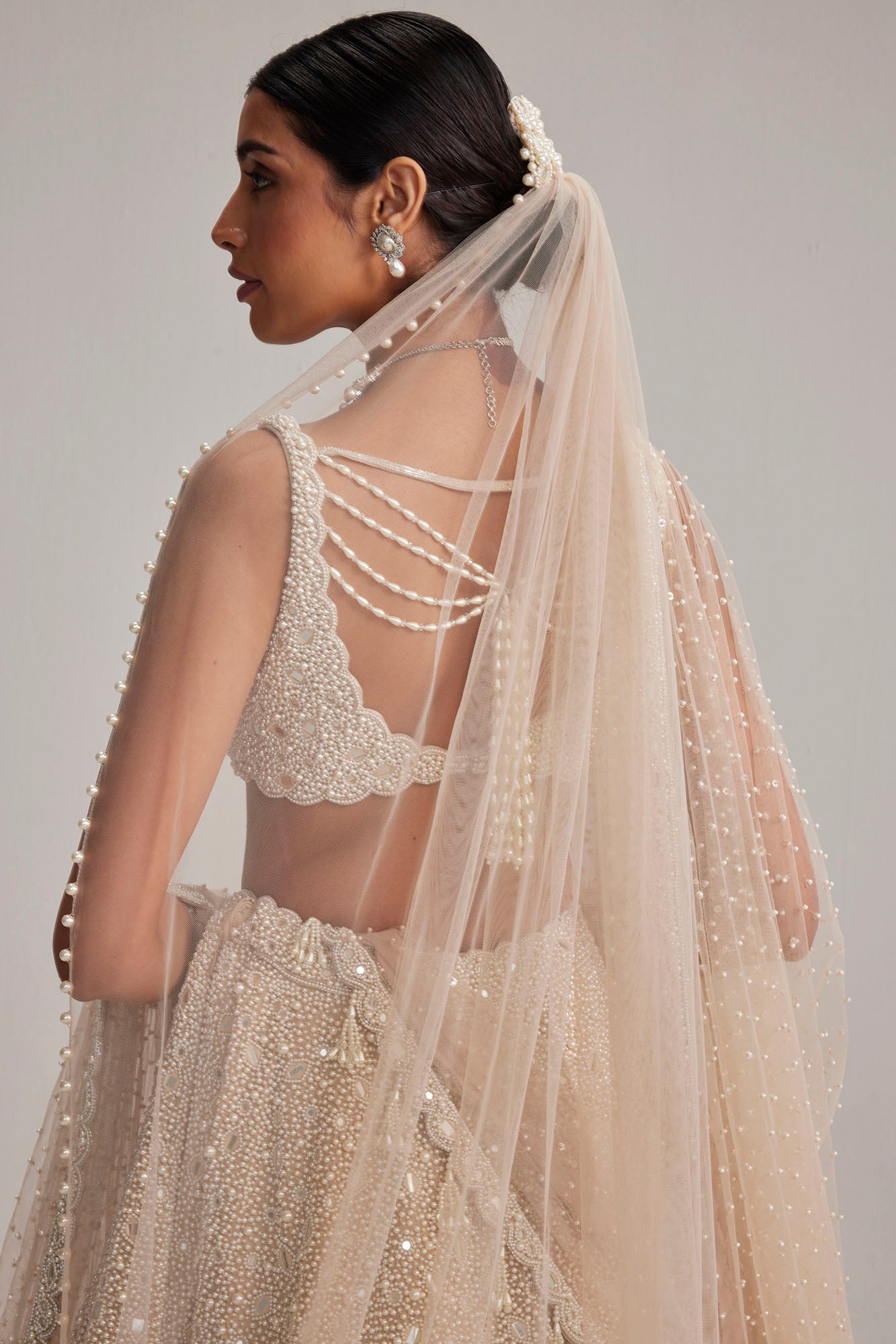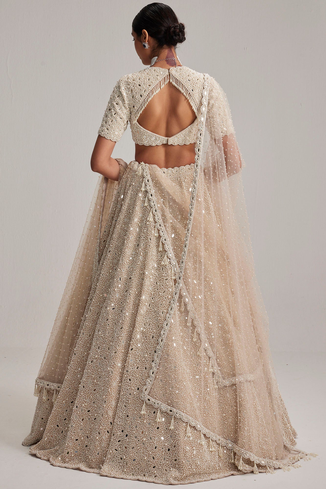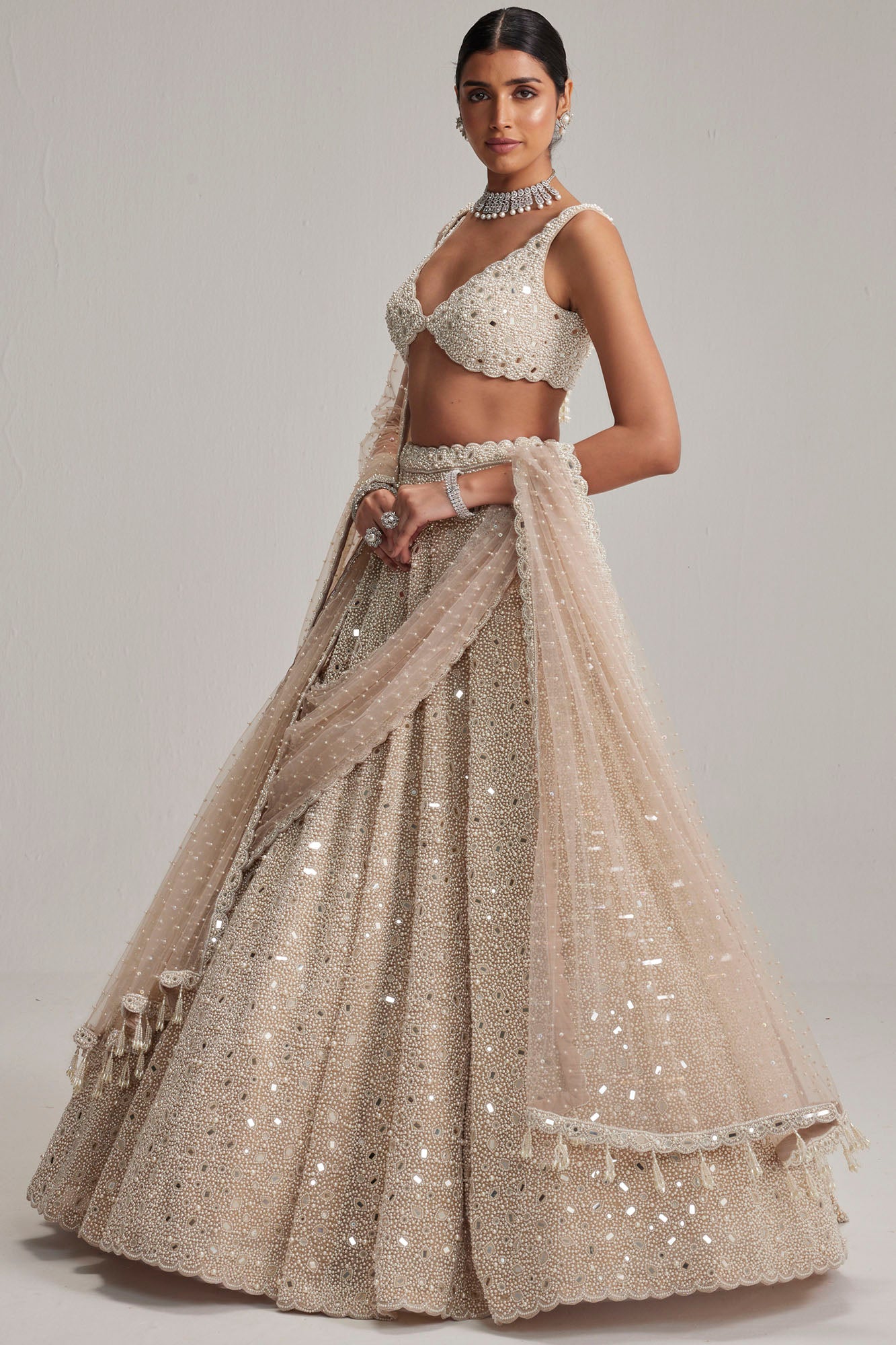 Light Beige Dense Mirror & Pearl Lehenga Set