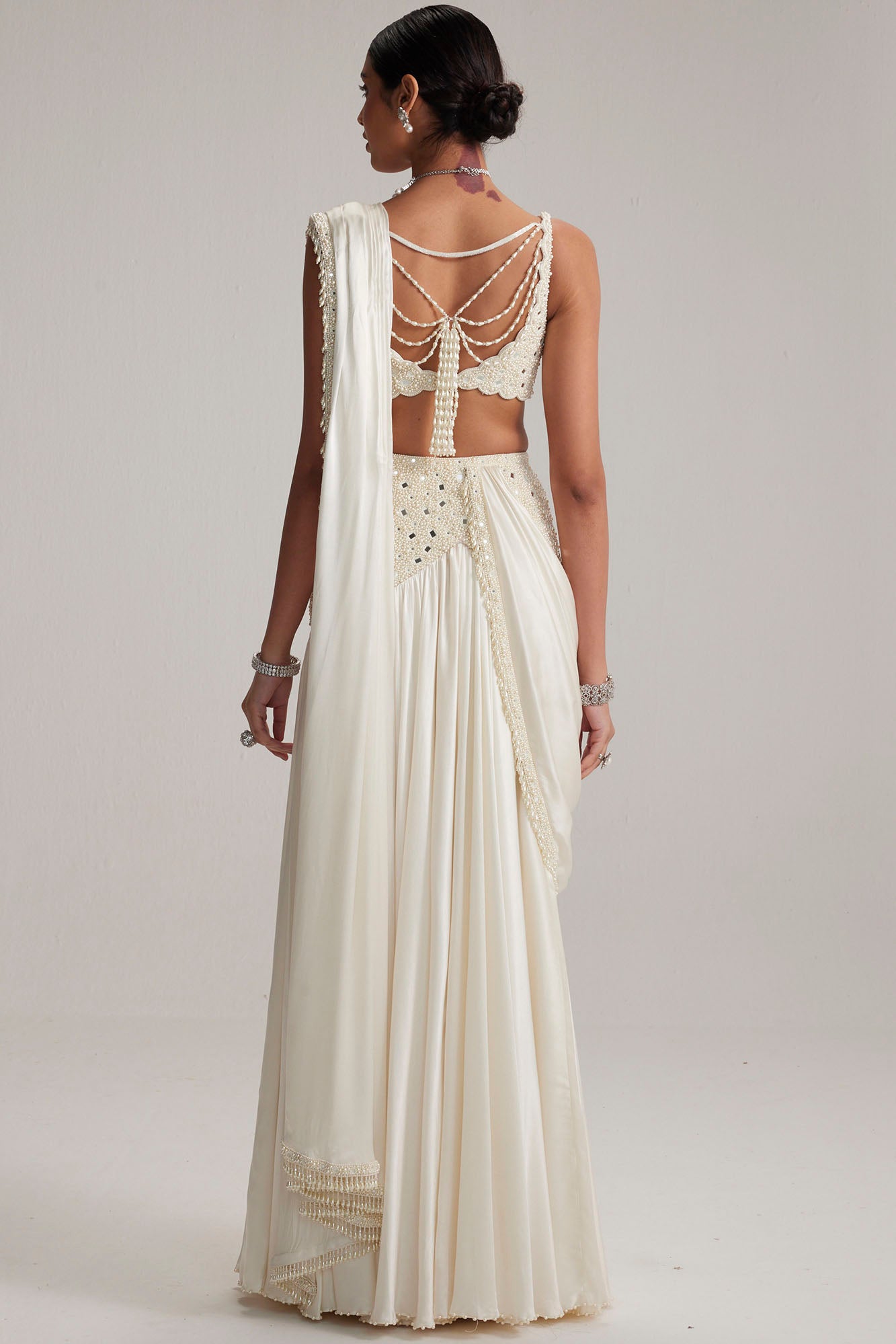Pearl White Satin Draped Saree Set