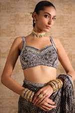 Inspired by palatial gardens & blooming flowers, our Zansi Saree features hand-block printed Ajrakh. Crafted by the indigenous communities of Gujarat, this craft involves an intensive sixteen-step process of washing, dyeing, printing, and drying. Created using intricate hand-block prints & eco-friendly dyes, it is an ancient craft passed down from generations. Made from silk, this eclectic drape is elevated in mirror, threadwork, metallic beads & sequins.