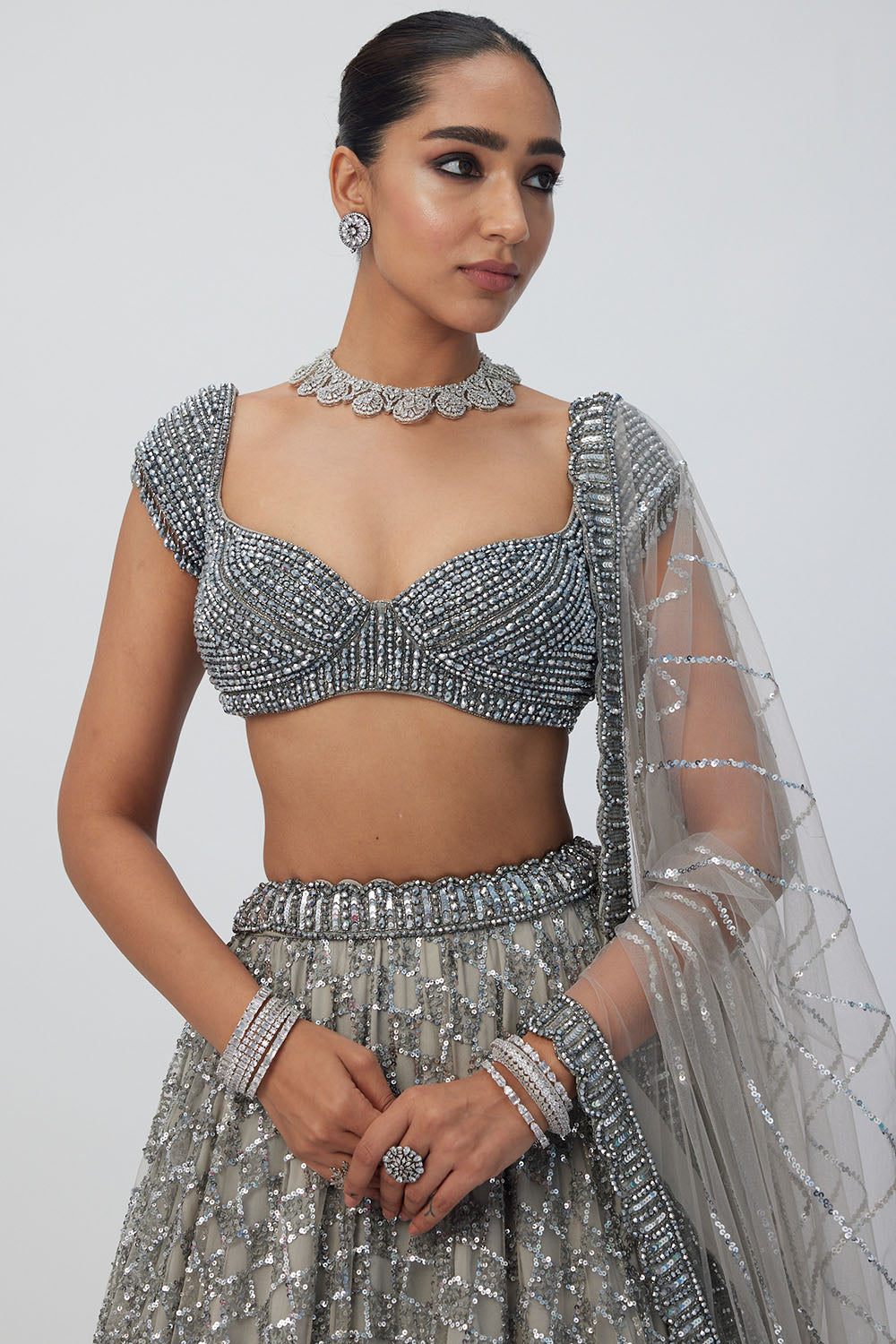 Sequins embroidered lehenga and dupatta clubbed with intricately hand embroidered jewelled blouse.