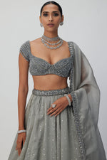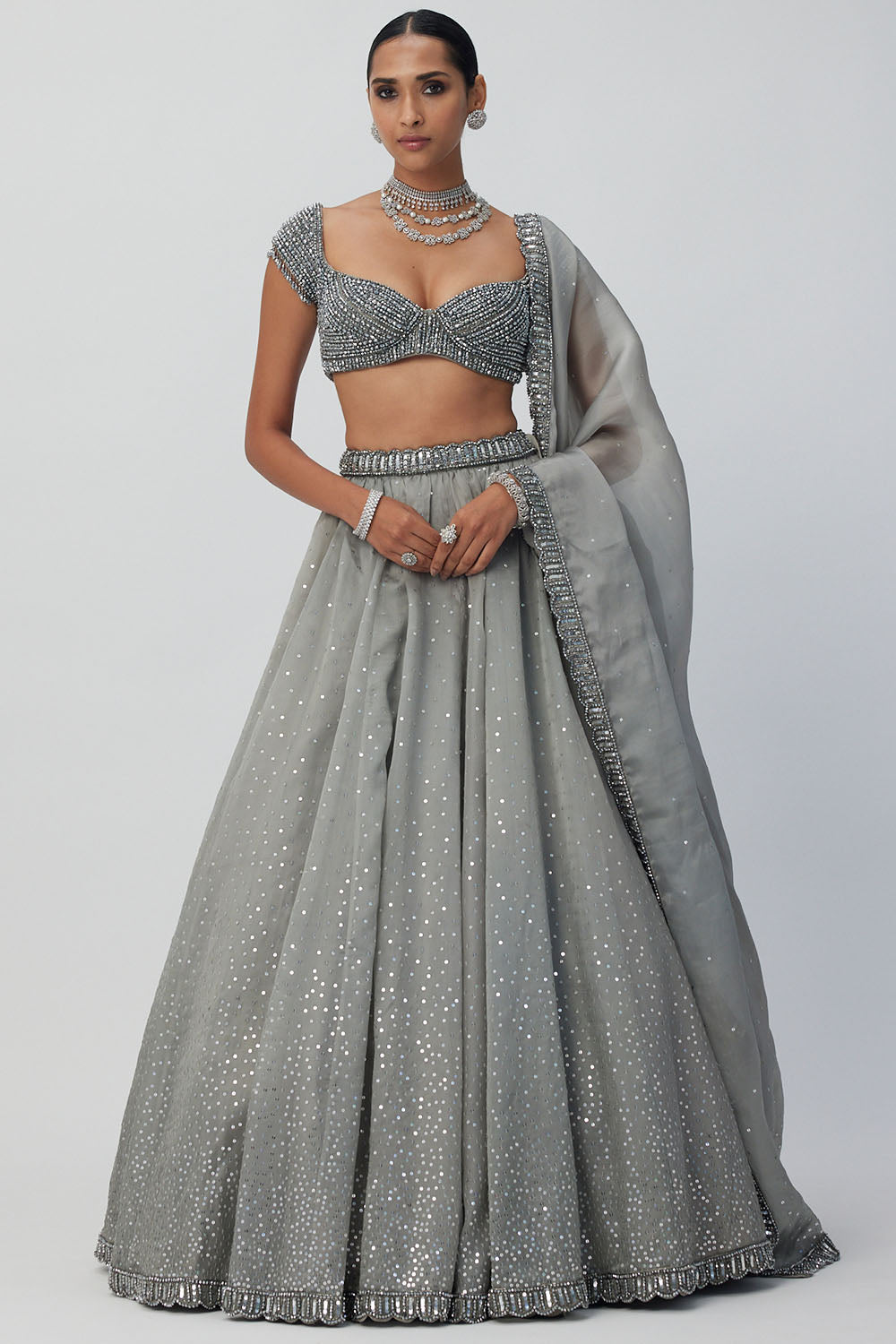 Intricately hand embroidered lehenga and dupatta featuring sequins and crystal embroidery clubbed with jewelled blouse with crystal embellishments.