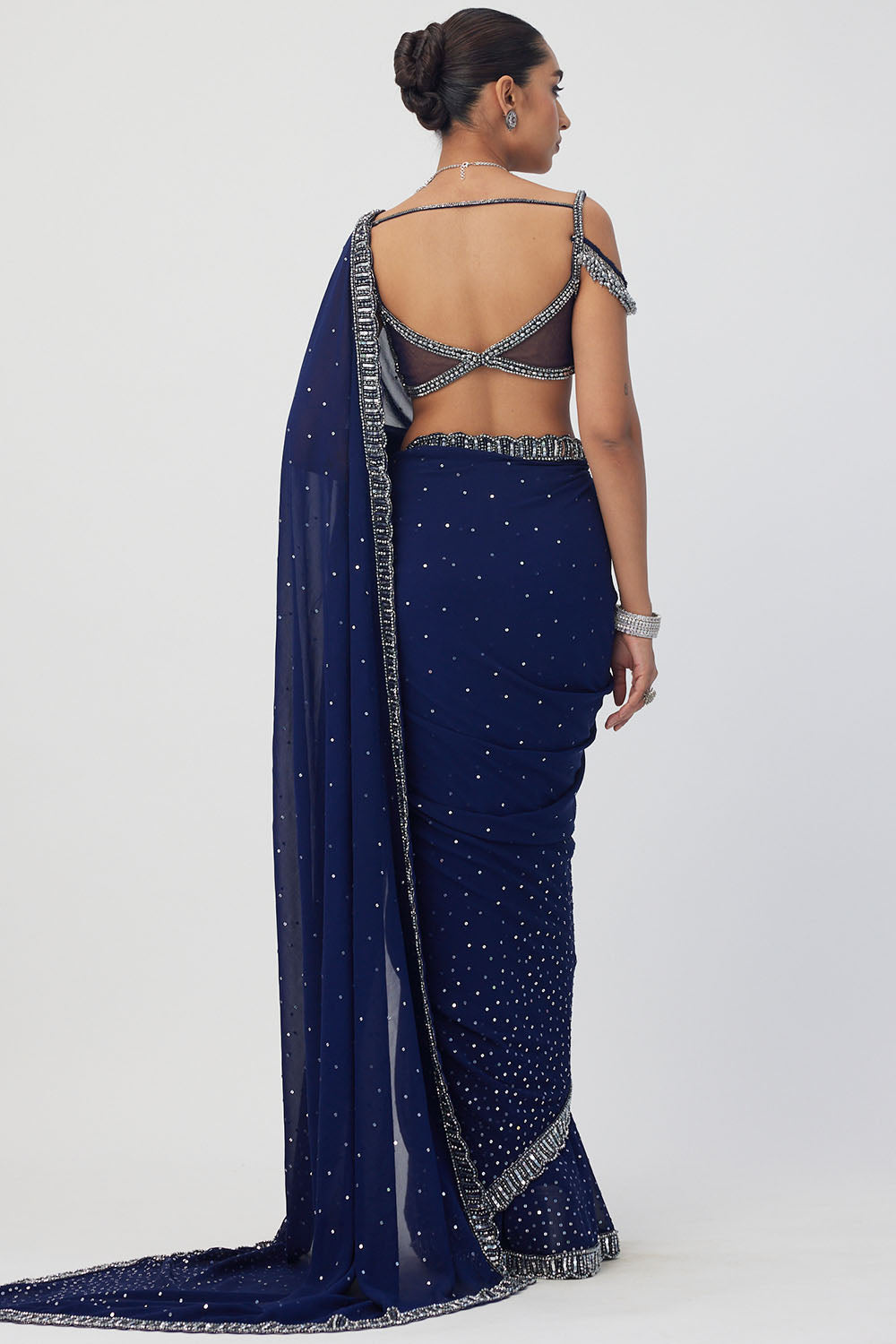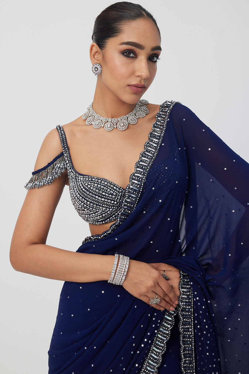 Intricately hand embroidered saree featuring sequins, cutdana and crystal embroidery clubbed with jewelled blouse with crystal embellishments.