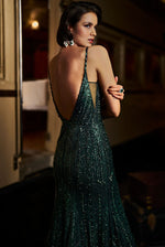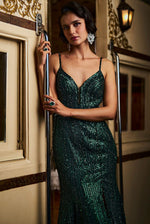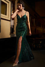 A full length gown featuring sequin and crystals in emerald green tones in a linear pattern. The bodice has a plunging neckline and a deep back with a high slit.