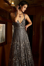 This dark brown gown features embroidery in tonal metallic platinum sequin and beads. The outfit has a plunging neckline and a razor back.