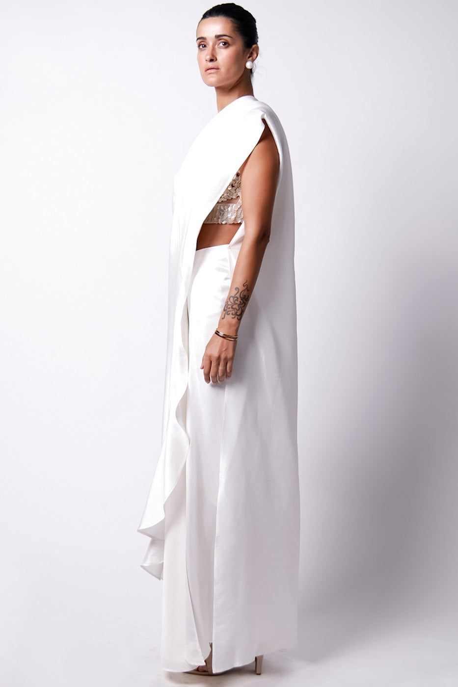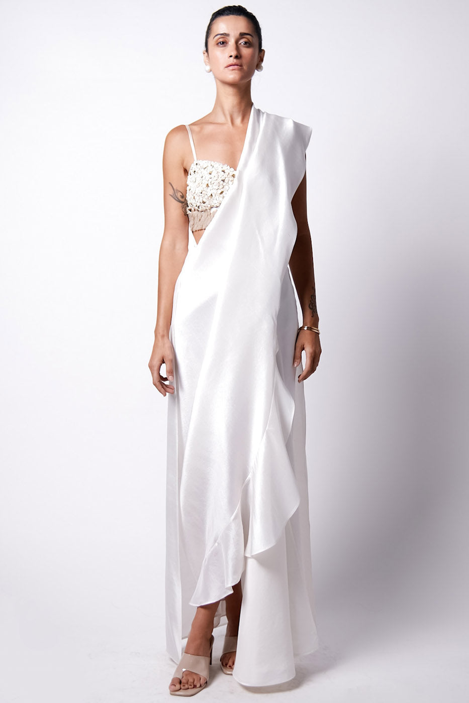 The all new Cape Sari drape which features a pre draped sari with a ruffled detail and pallu that looks like a cape from the back. It has snap buttons on the pallu that gets attached to the sides of the waist. Paired with the new Iris Bustier which is hand embroidered with shells and sequins. Closes at the back with hooks and is perfect for those destination day weddings.