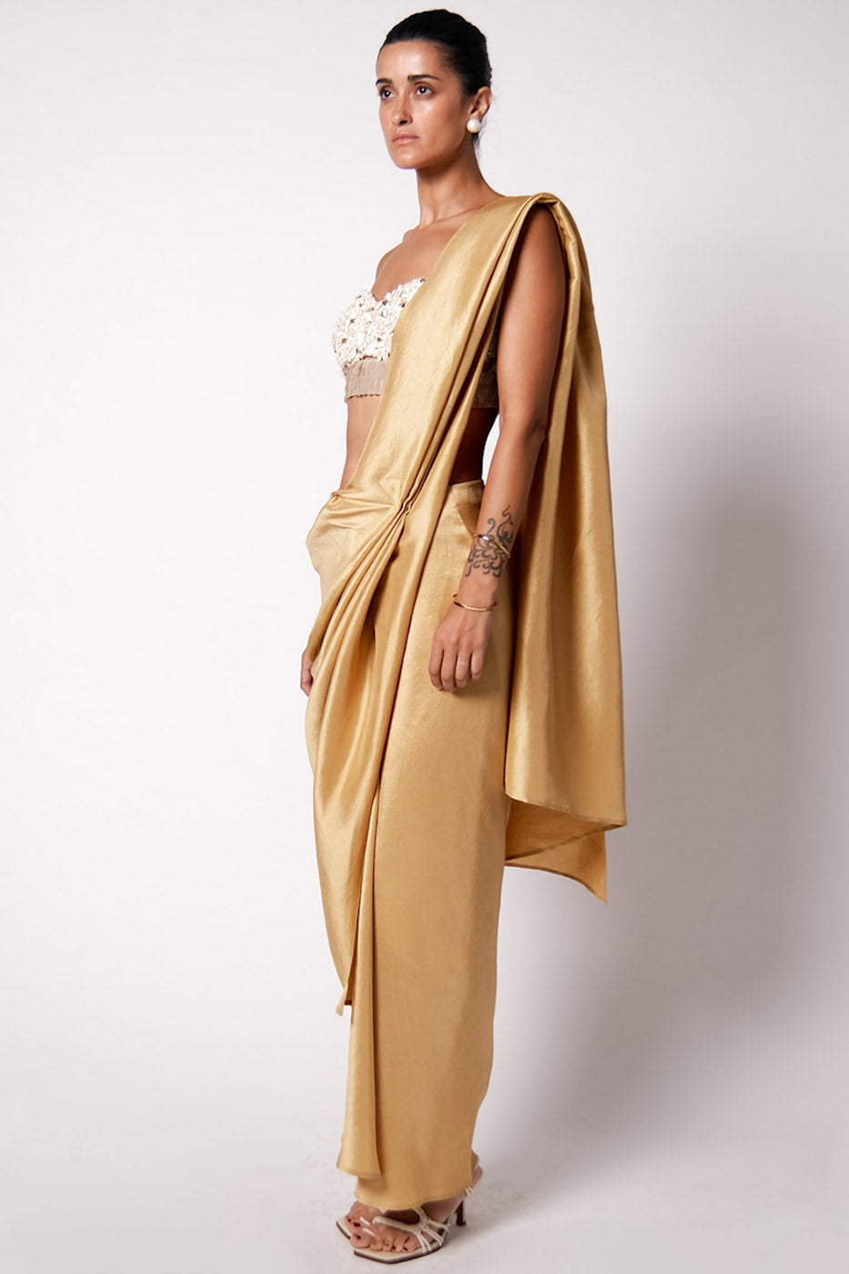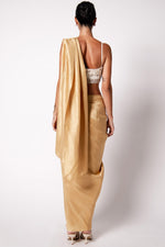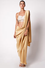 The Masai Godet Sari is pre draped and fuss free. With a built in petticoat, the pallu gets attached to the waist with the clever use of a snap button and stays on while you are on the move. Paired with the new Iris Bustier which is hand embroidered with shells and sequins. Closes at the back with hooks and is perfect for those destination day weddings.