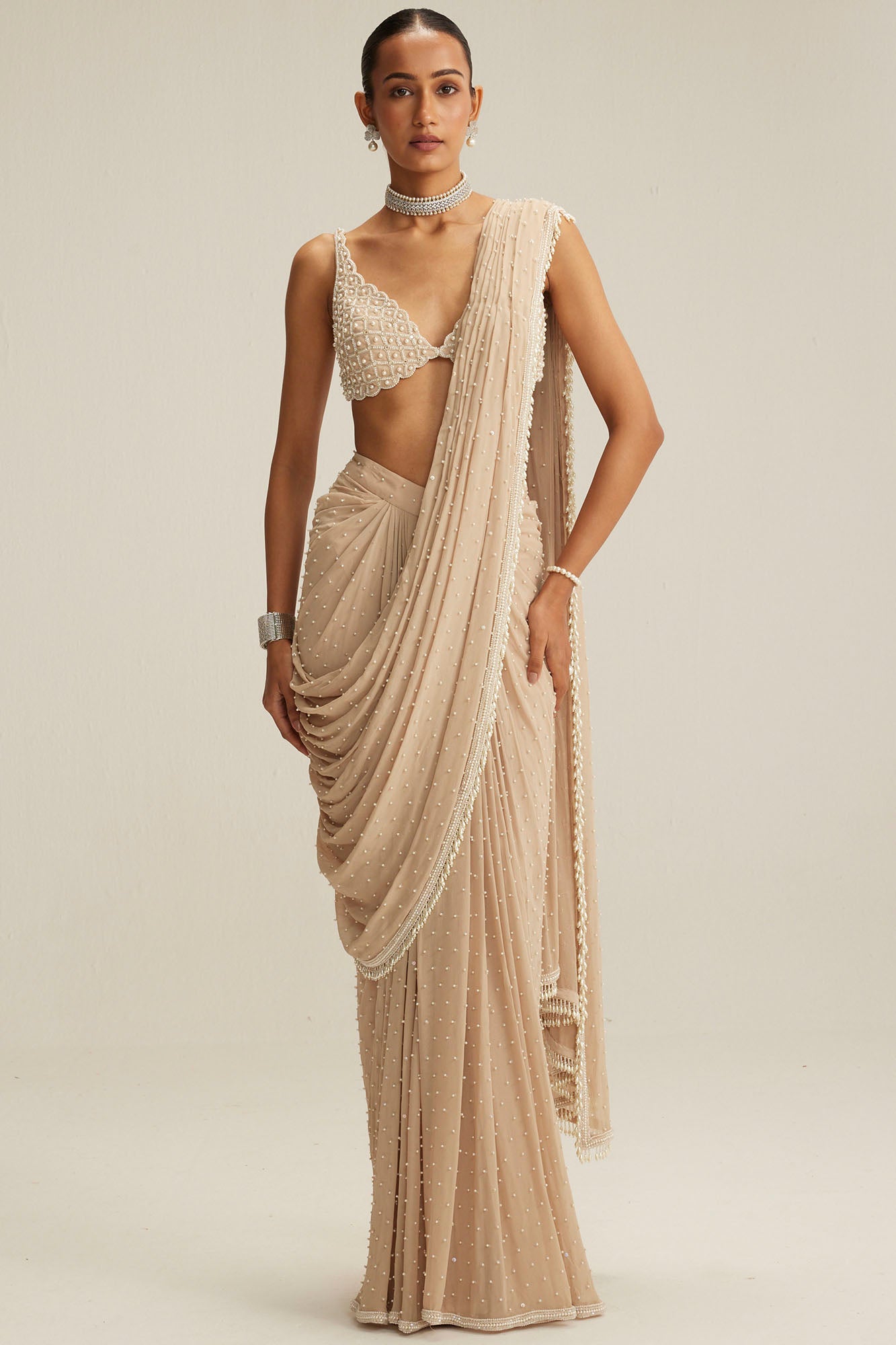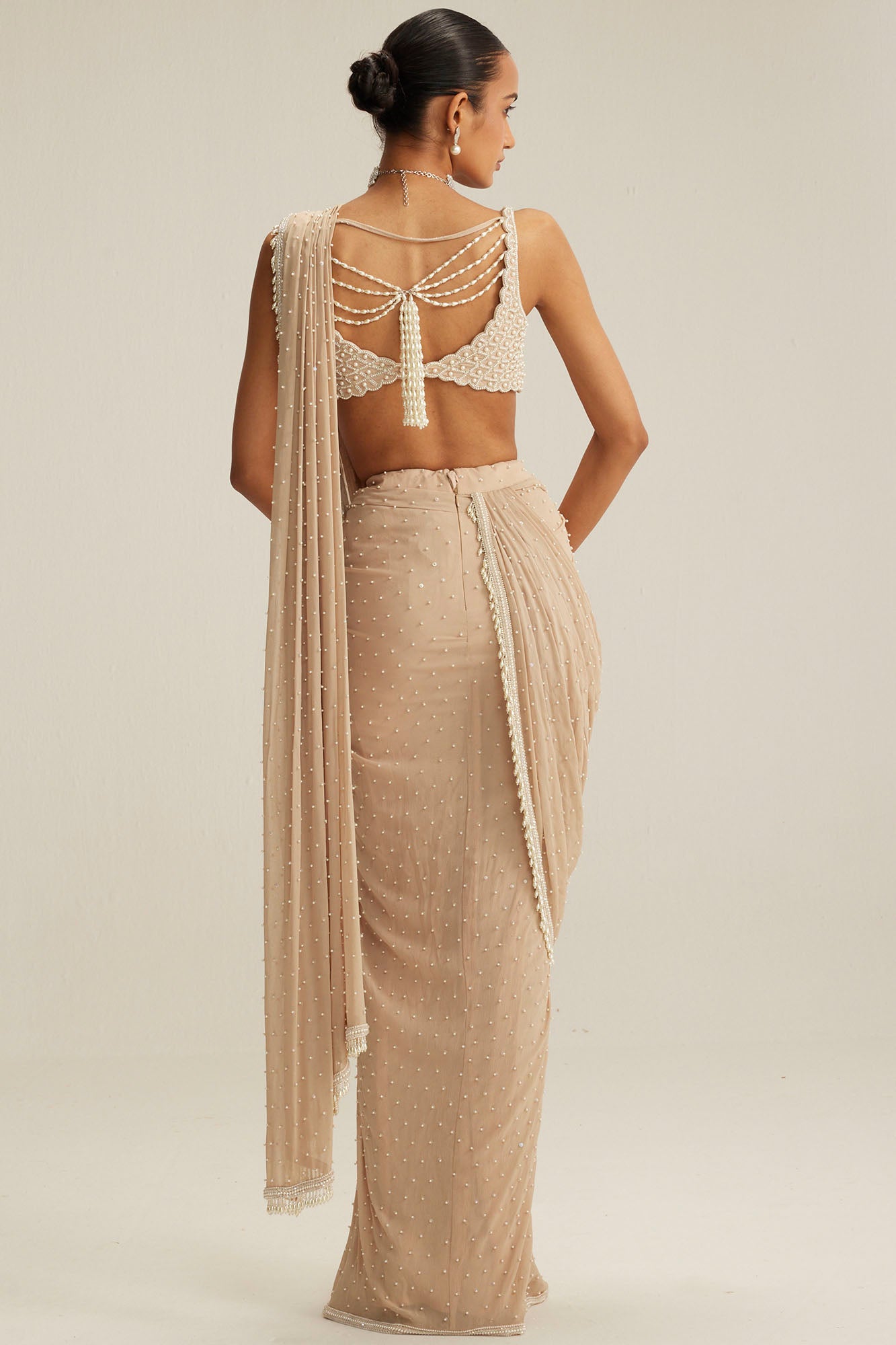 Light beige draped saree set, adorned with mirror and pearl embroidery and cascading pearl tassels, paired with a heavily embroidered V-neck blouse.