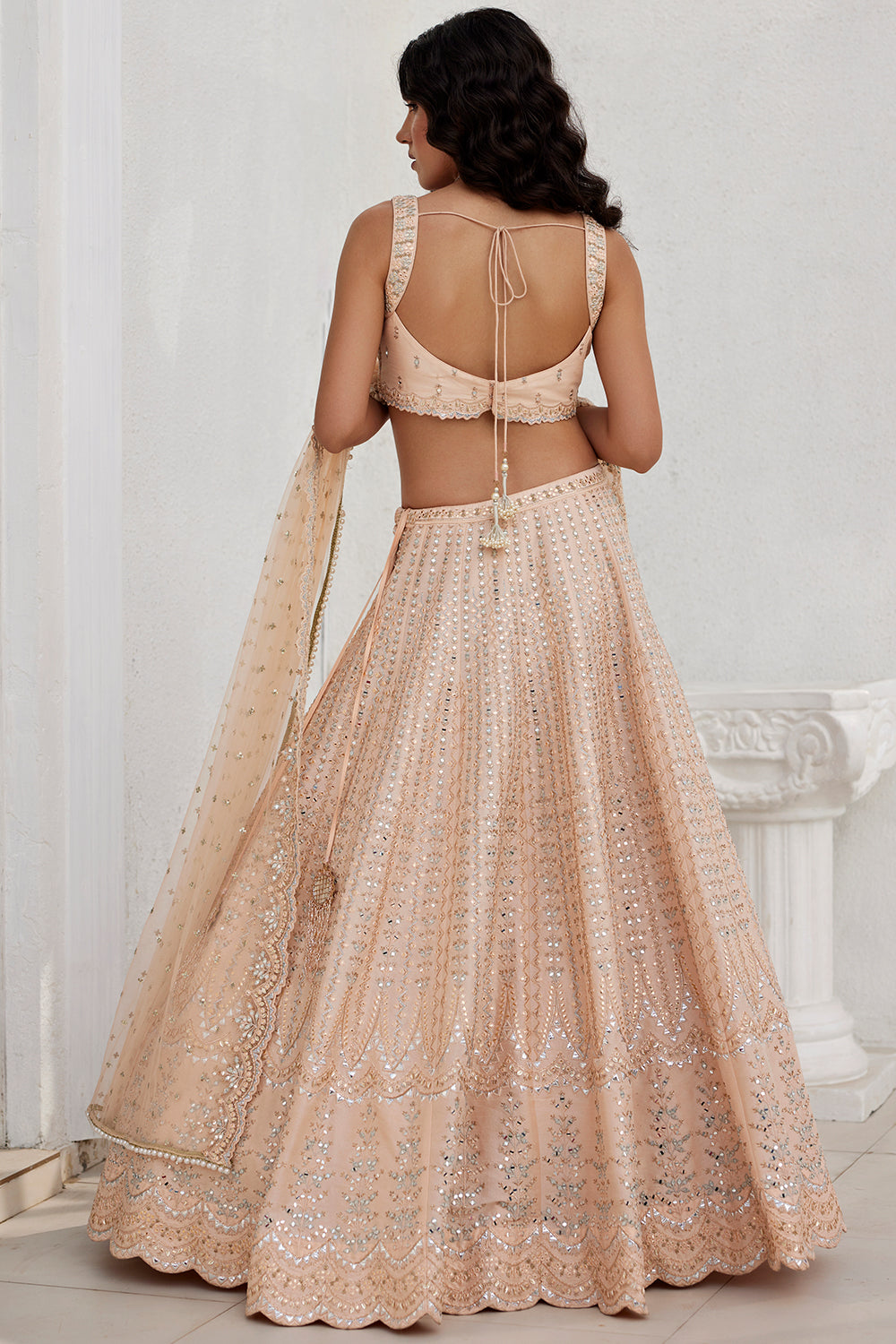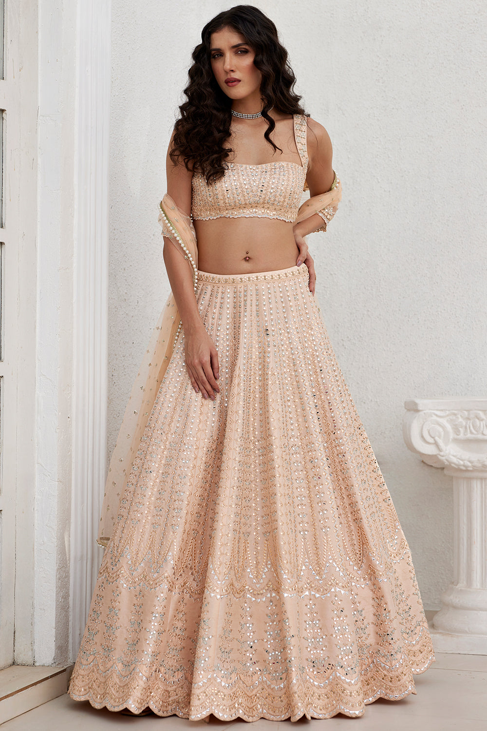 Dusty peach mirror and leather appliqué skirt on Dupion silk paired with embroidered top and tulle dupatta.